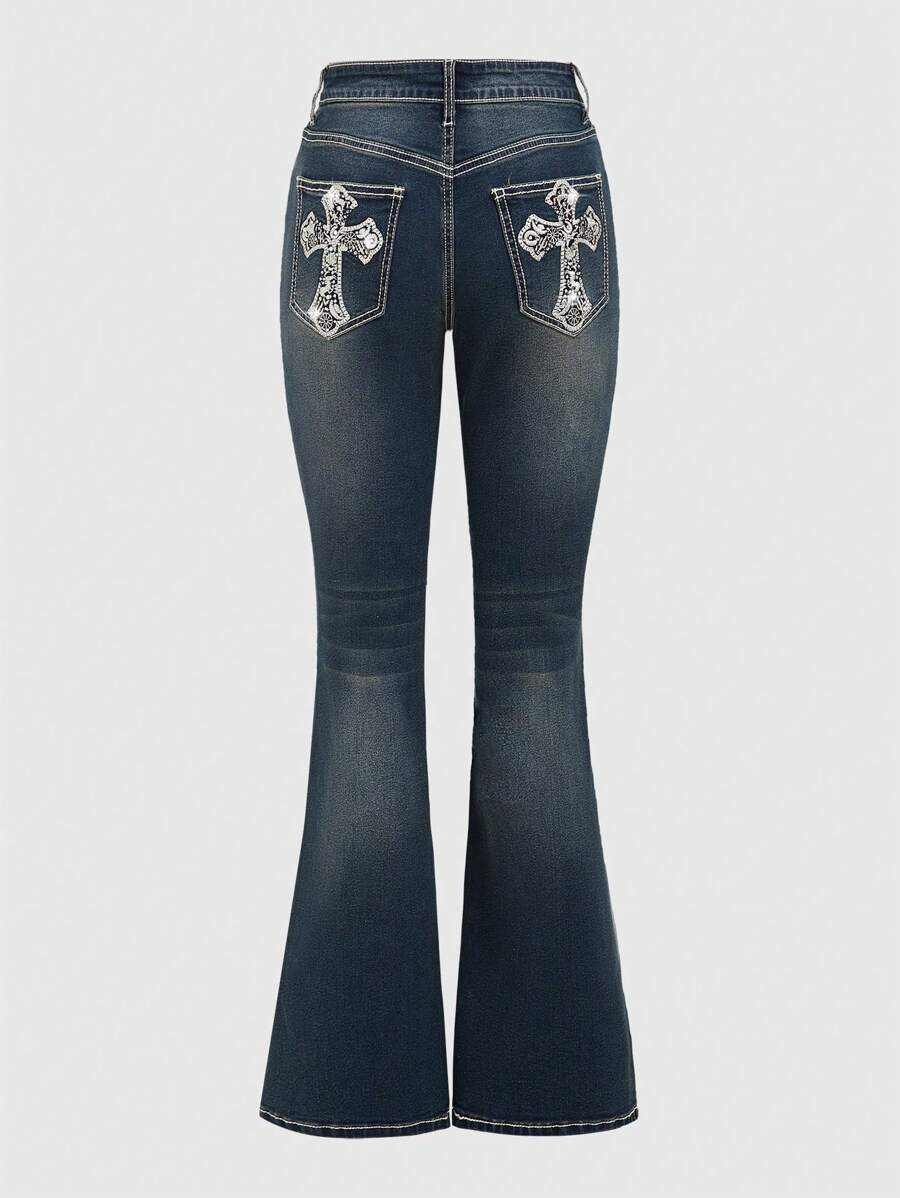 Grunge Punk Jeans Skinny a zampa con ricamo di stelle, luna e croce, decorati con strass - stile retrò Y2K, ideali per la scuola