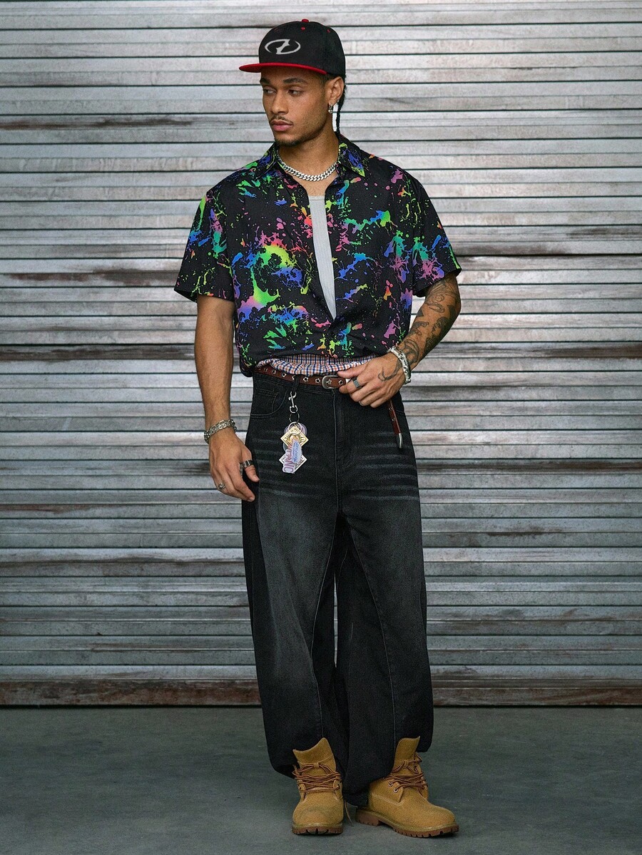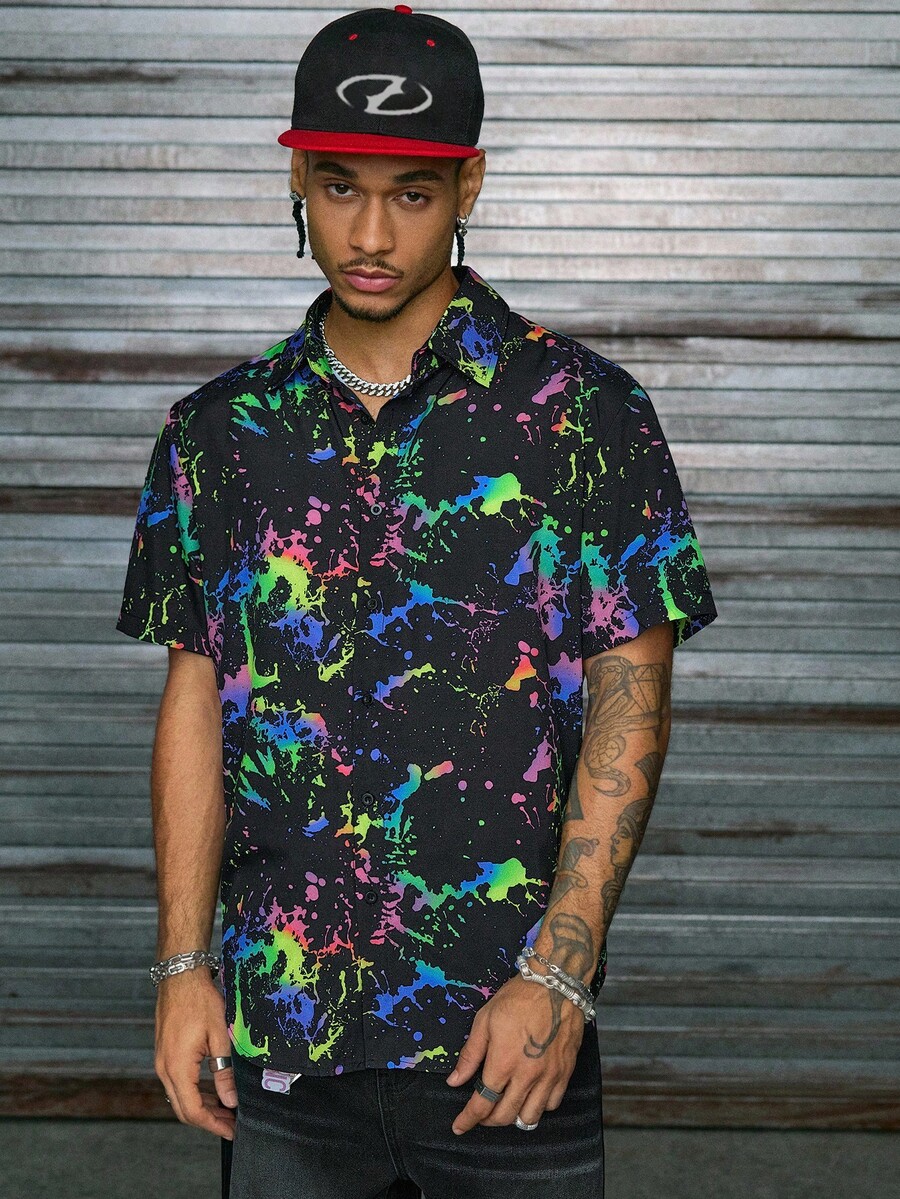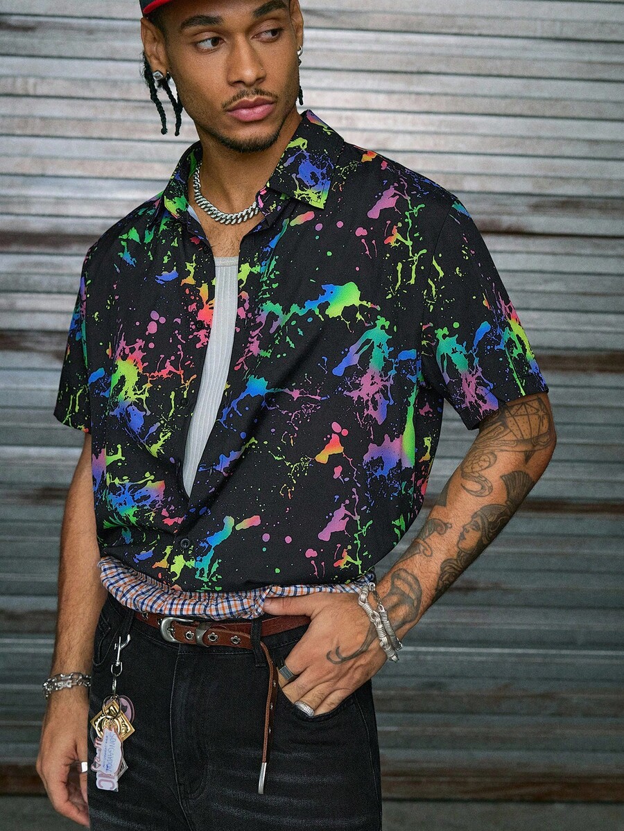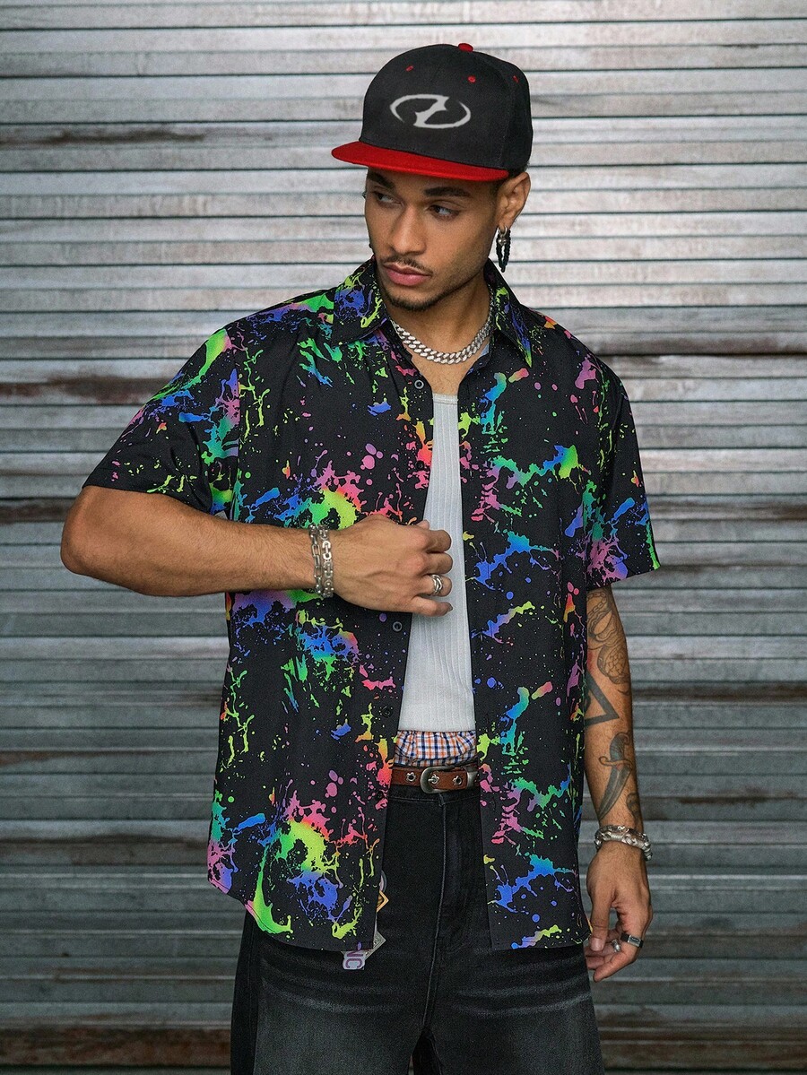 Camicia da uomo con stampa riflettente a macchie di inchiostro, camicia a maniche corte con bottoni e graffiti glitterati colorati, abbigliamento streetwear