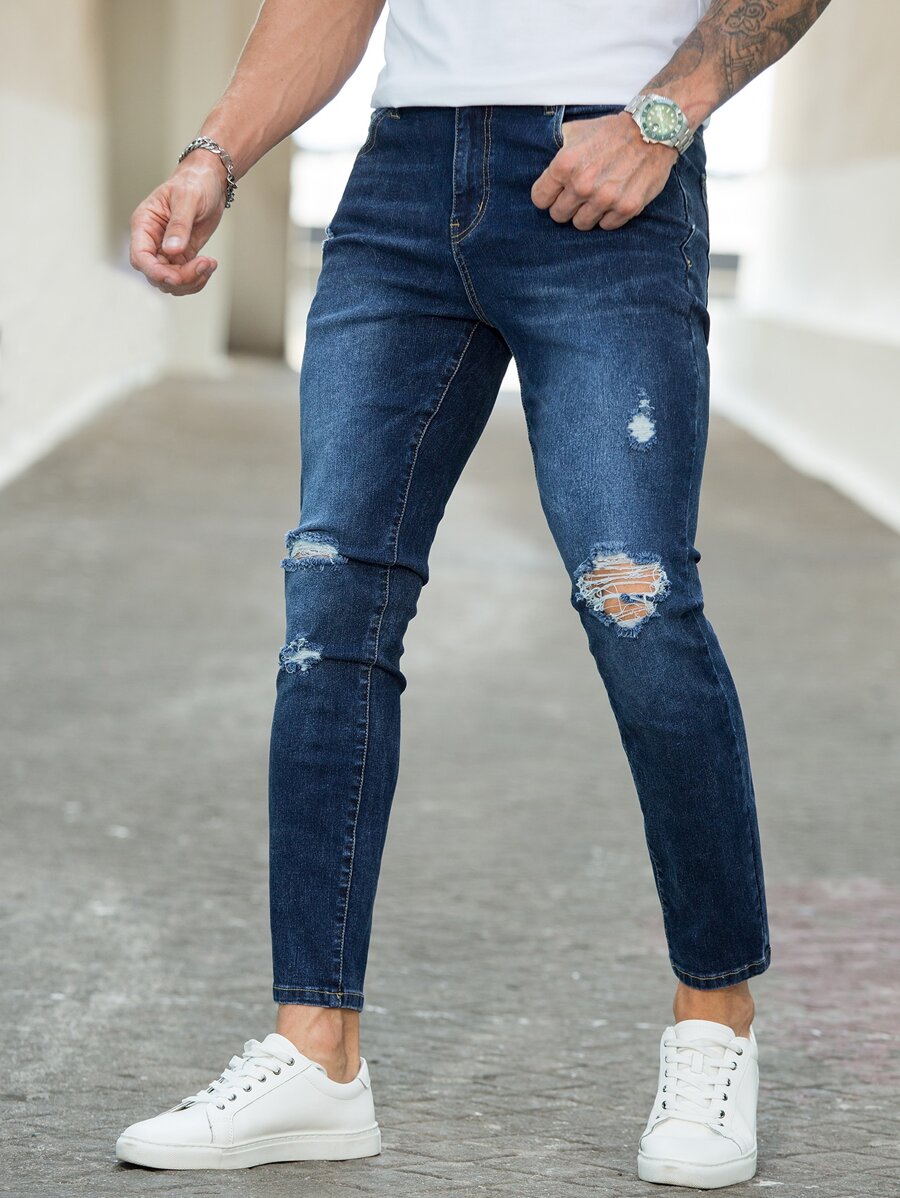 Jeans elasticizzati aderenti da uomo con strappi e tasche con cerniera
