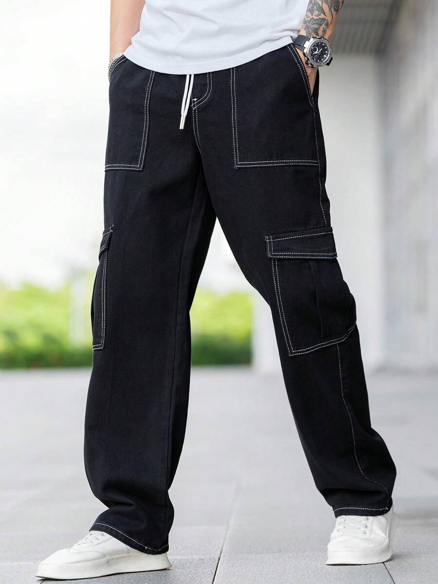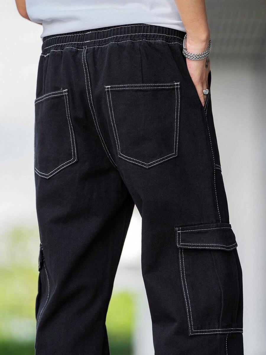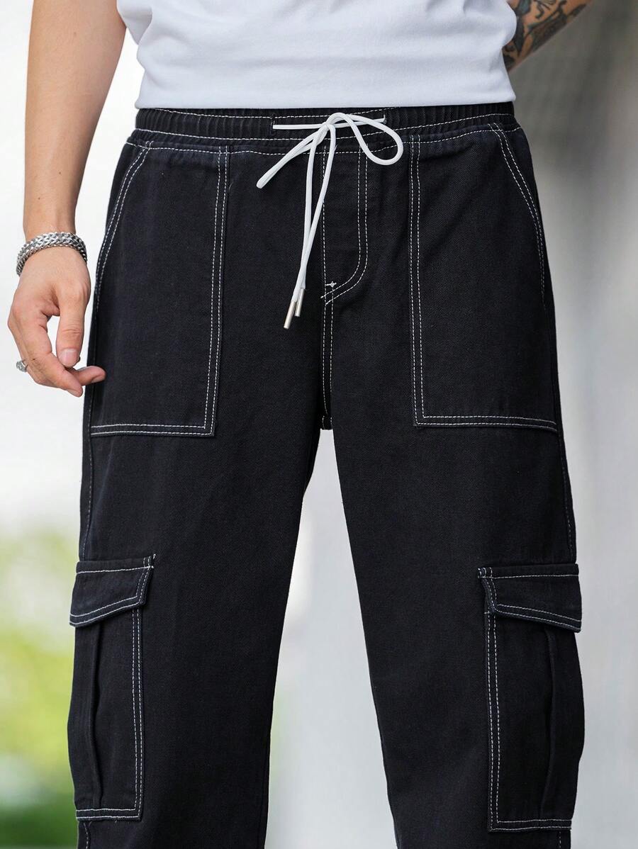 Jeans cargo larghi da uomo con dettagli in topstitching, tasche con patta, vita con coulisse e regolatori laterali, jeans cargo neri lavati larghi e semplici, per marito o fidanzato come regalo