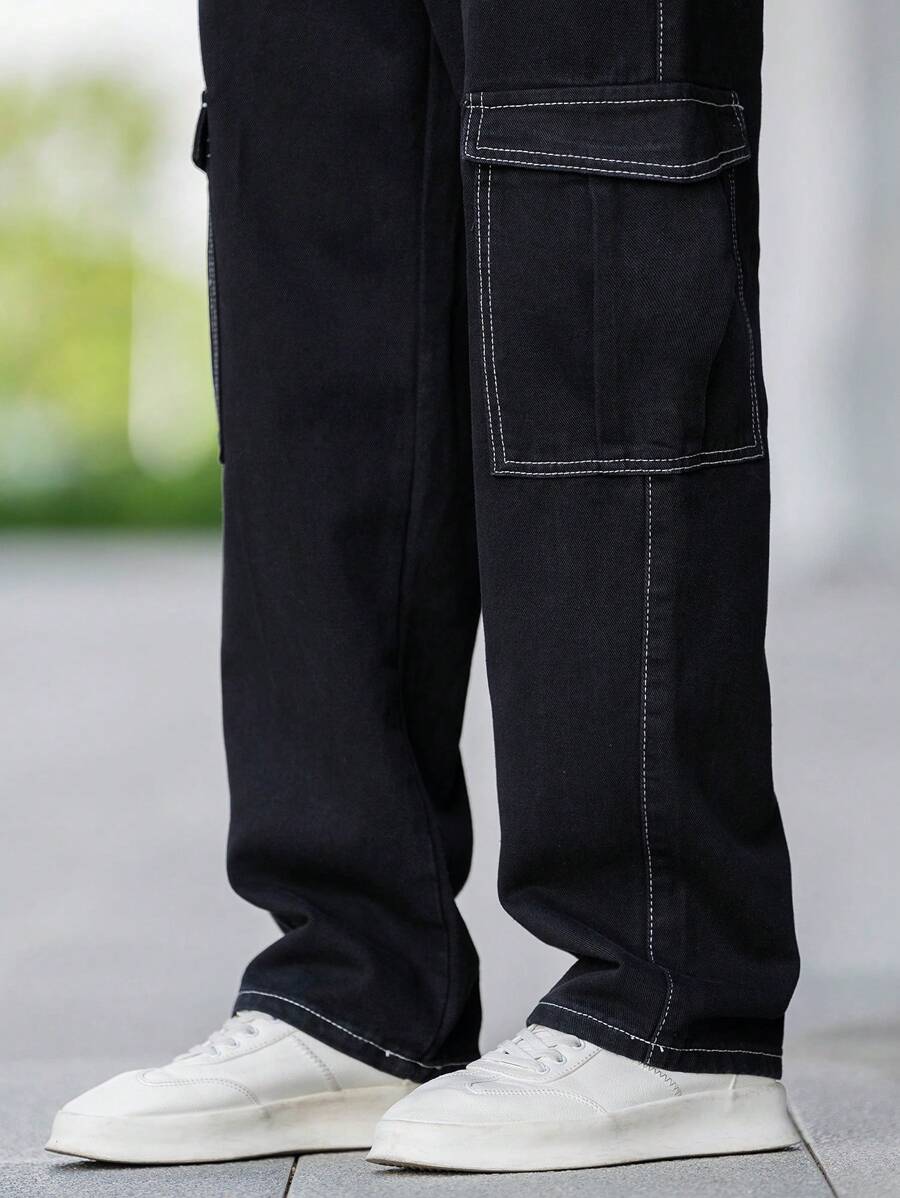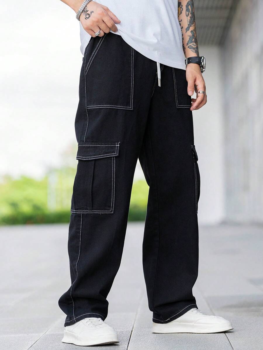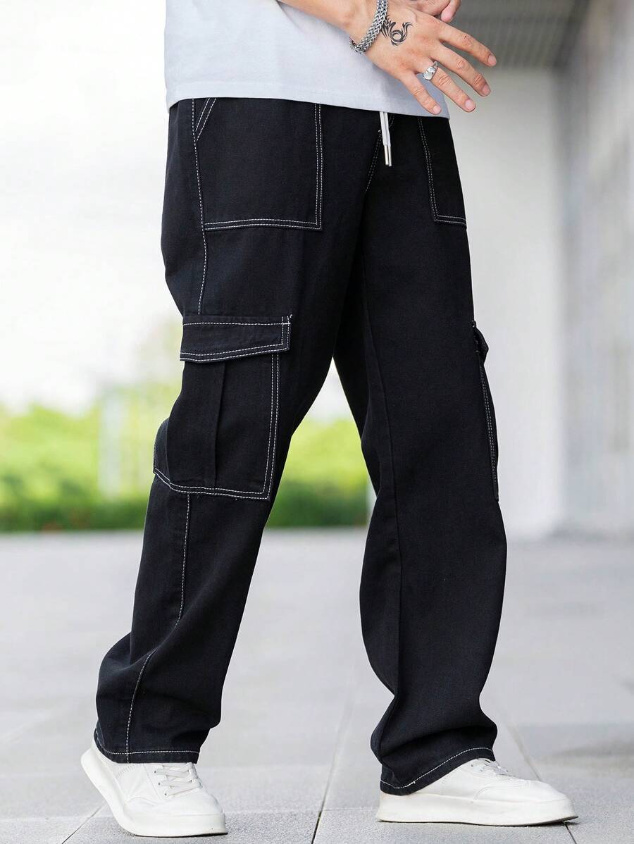 Jeans cargo larghi da uomo con dettagli in topstitching, tasche con patta, vita con coulisse e regolatori laterali, jeans cargo neri lavati larghi e semplici, per marito o fidanzato come regalo
