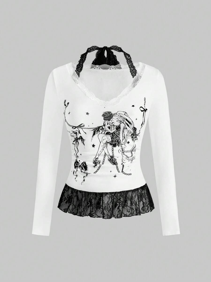 Maglietta a maniche lunghe con croce scura e contrasto in stile anime di Ognissanti (include sottogiacca in pizzo e orlo in pizzo patchwork)