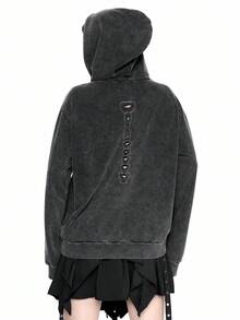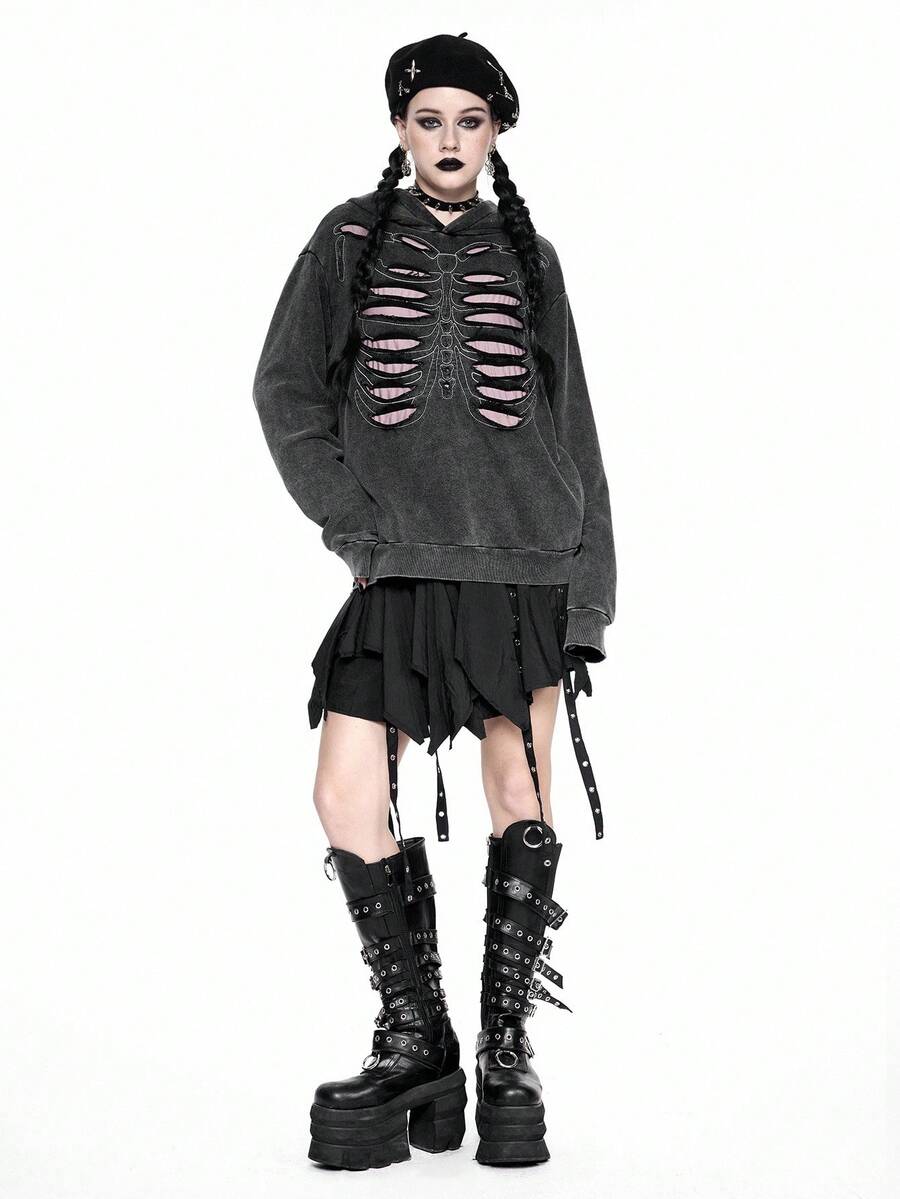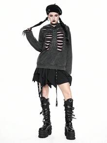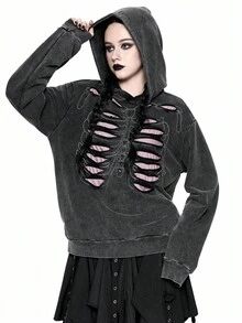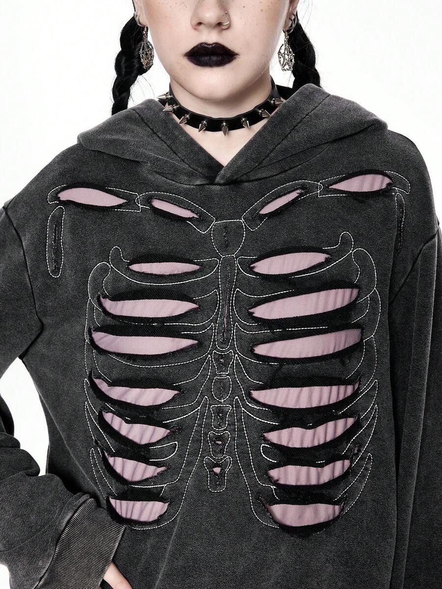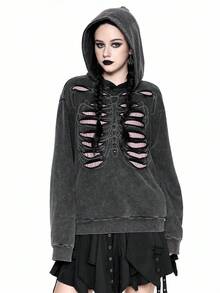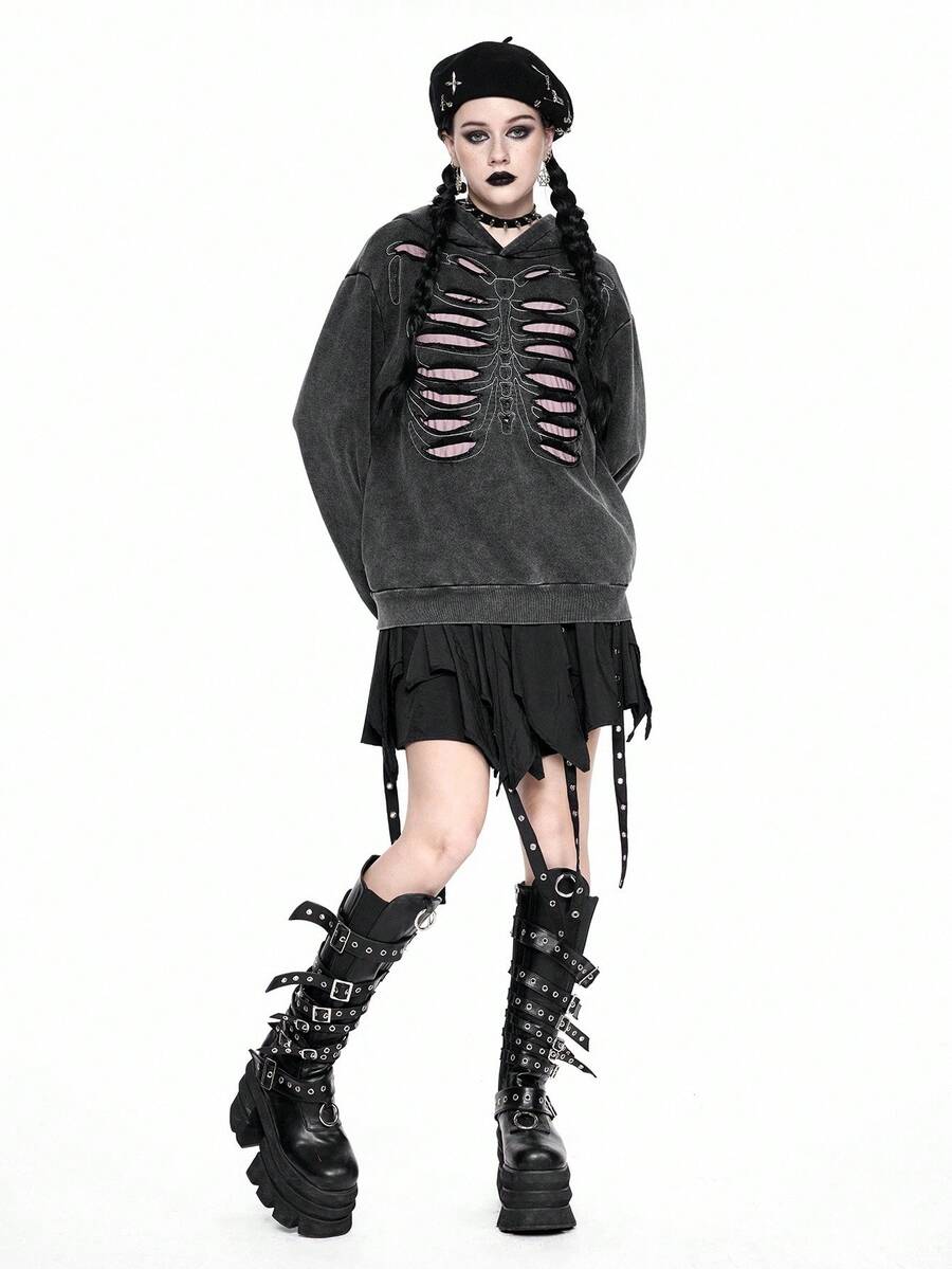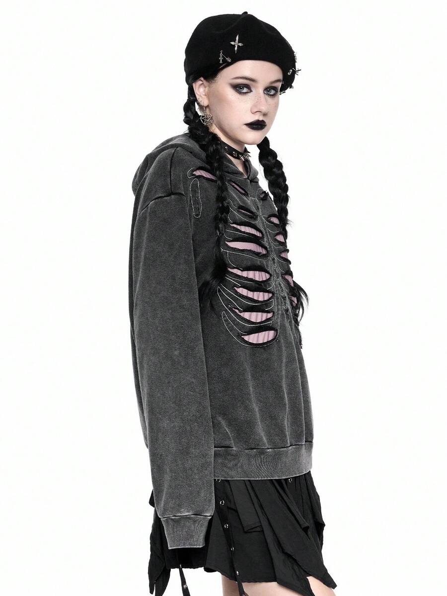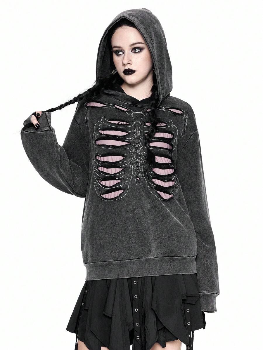 Goth Felpa con cappuccio a maniche lunghe con stampa teschio distorta e traforata, con tasche, stile gotico, adatta per Ognissanti, per donne