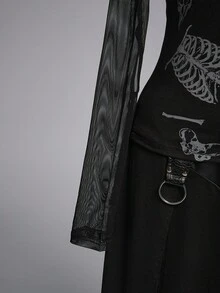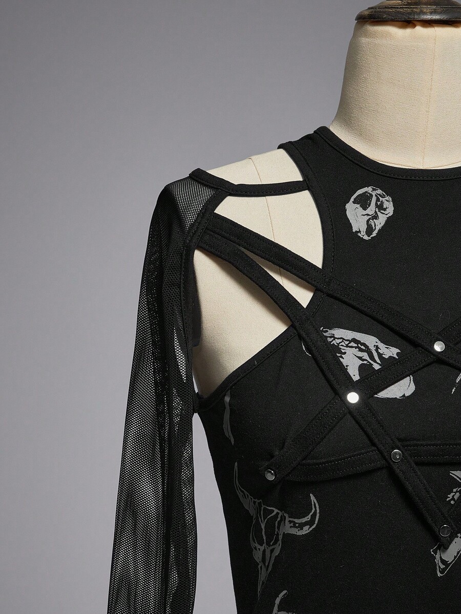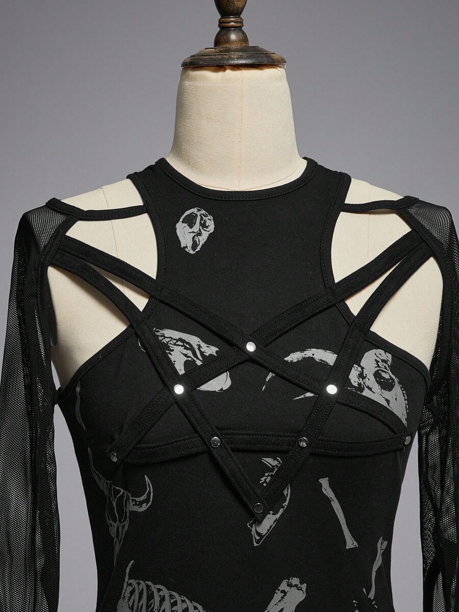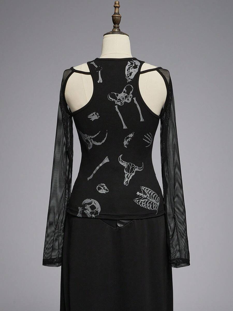 Goth Maglietta da donna con stampa gotica di scheletri di animali e umani e design con spalle scoperte