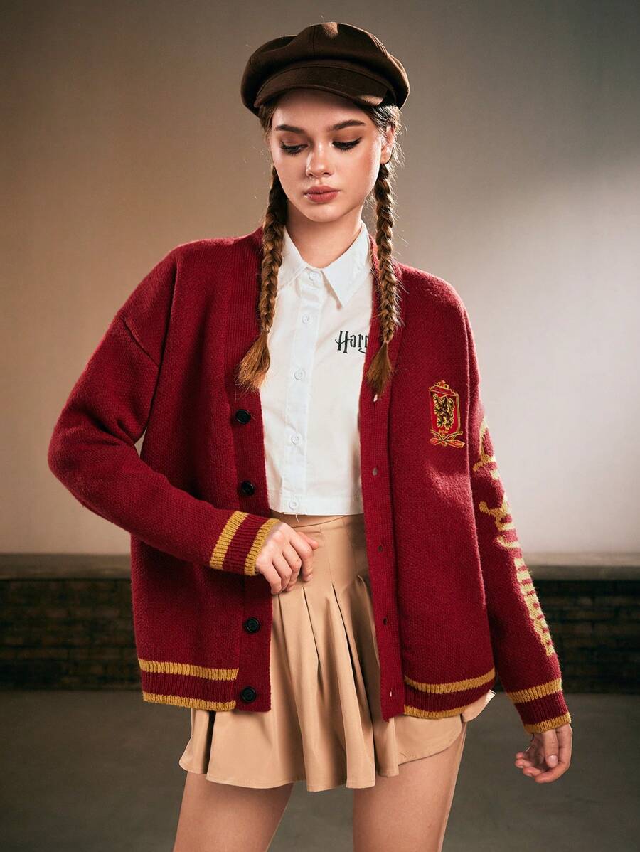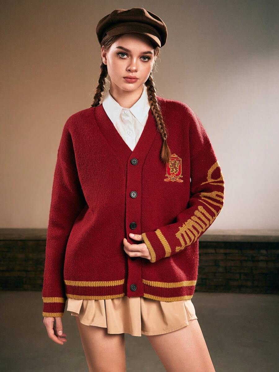 Harry Potter | ROMWE Cardigan oversize smanicato morbido con logo ricamato della Casa Grifondoro per donne