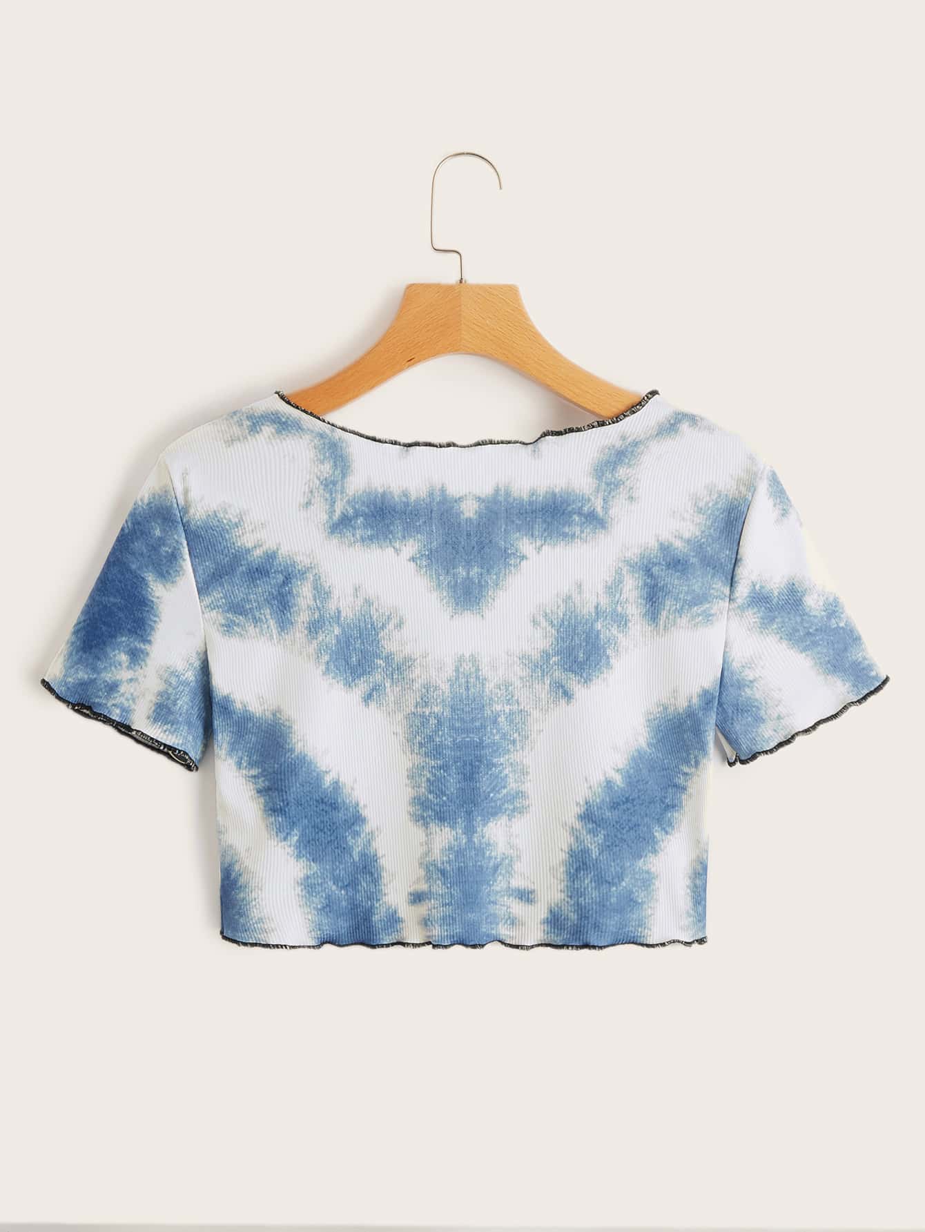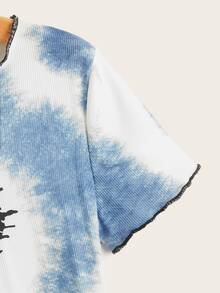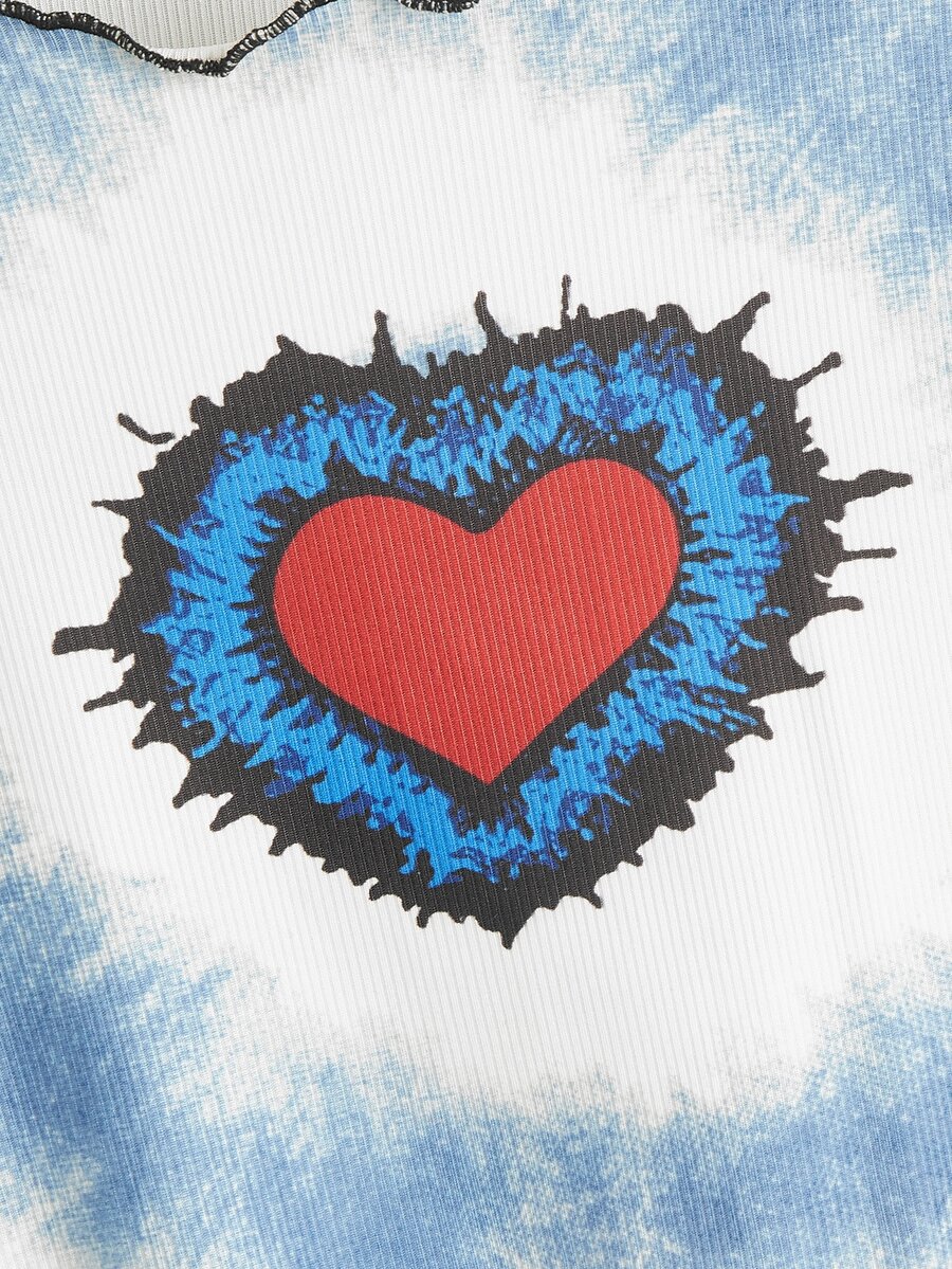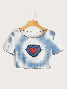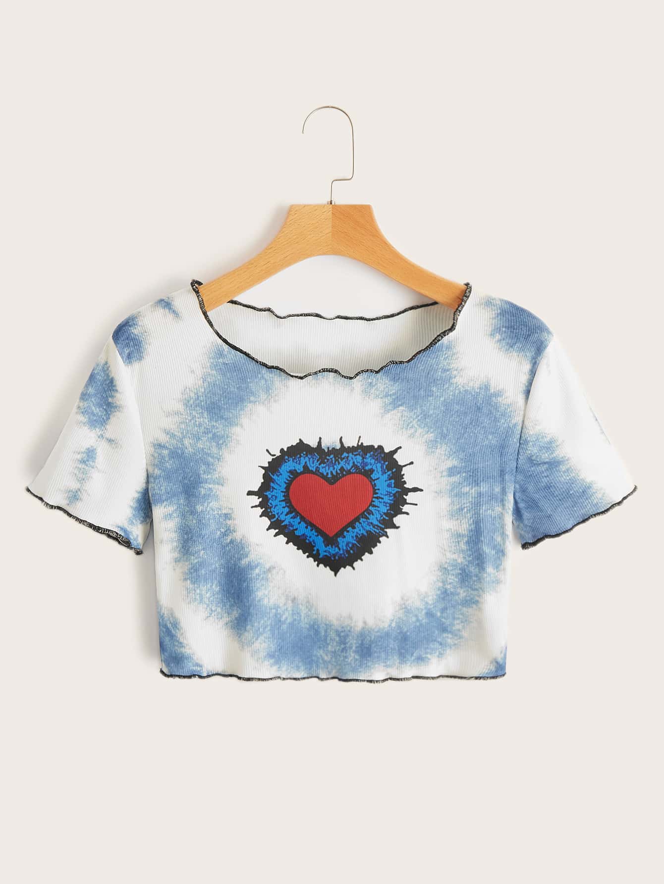 Maglietta corta grafica cuore tie dye orlo lattuga a costine