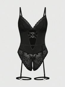 Body in lingerie sexy con anello metallico a forma di cuore, guarnizione in pizzo a forma di cuore e cinturino senza cavallo