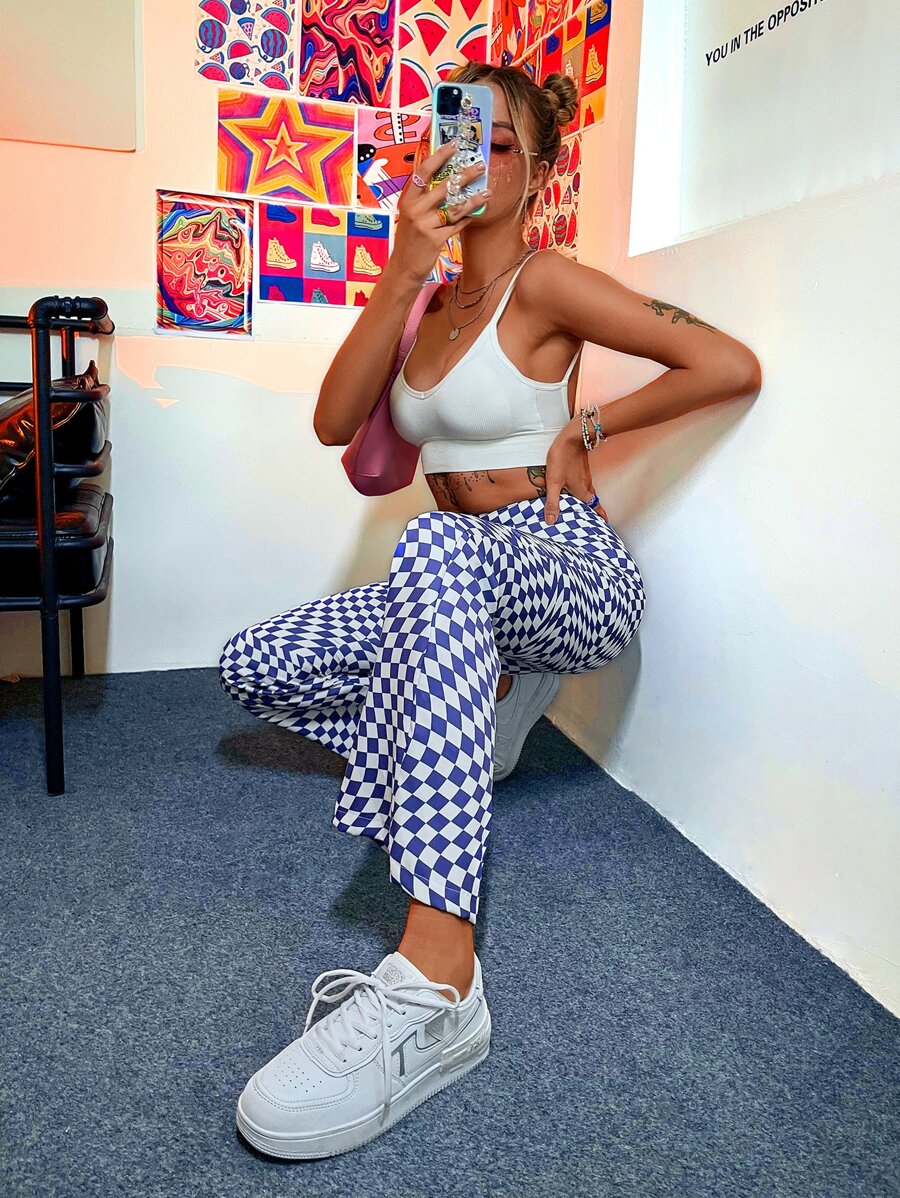 Pantaloni a zampa con stampa a scacchi a vita alta