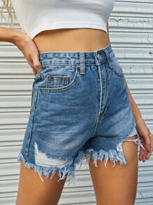 Shorts in denim strappati con orlo sfrangiato con vita alta