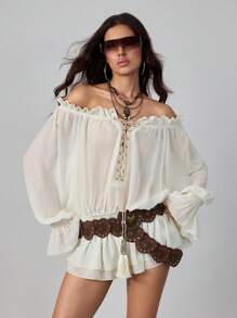 Camicia da donna stile hippie boho con spalle scoperte, maniche a lanterna e pizzo traforato con allacciatura