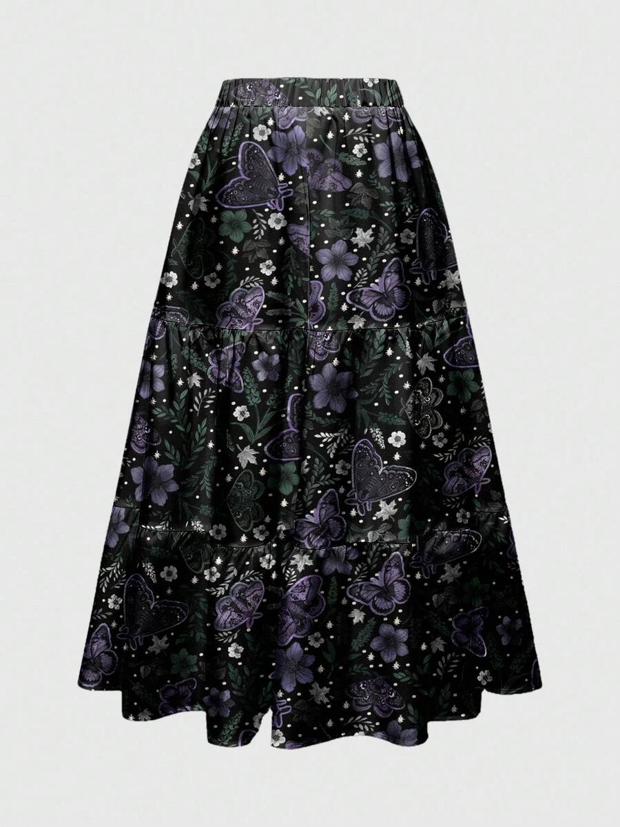 Fairycore Gonna bohémien stile gotico elegante con stampe floreali, falene, pipistrelli, soli, lune, stelle e farfalle nei colori blu, verde e viola per le donne