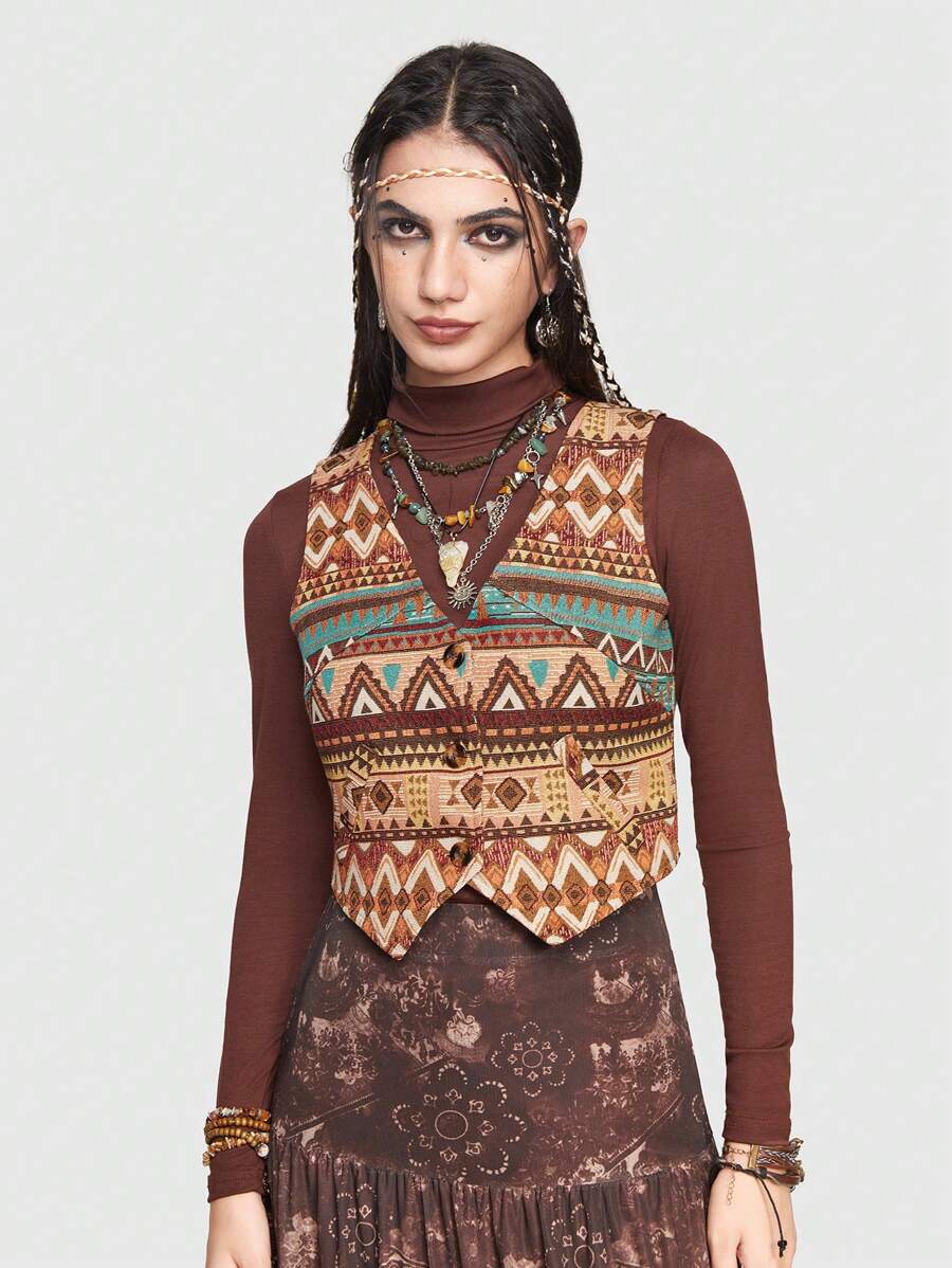 Hippie Gilet giacca con stampa geo orlo asimmetrico