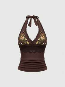 Hippie Top sexy senza maniche da donna con scollo a V, ispirato alla natura, con ricamo floreale e di api, dal colore caffè, perfetto per le vacanze