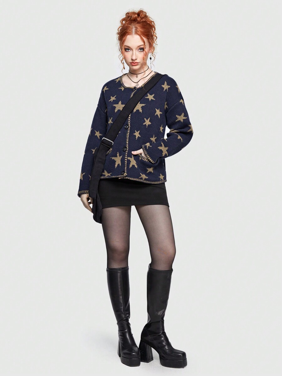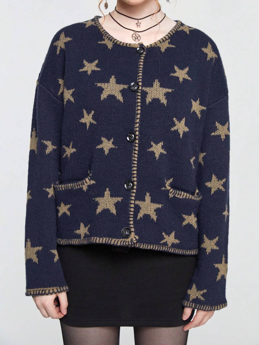 Hippie Cardigan con scollo a goccia e stampa a stelle, adatto per la scuola e per le donne in tarda primavera, casual con bottoni, tasche, collo tondo e vestibilità regular, in blu navy con stampa geometrica, per uso quotidiano casual