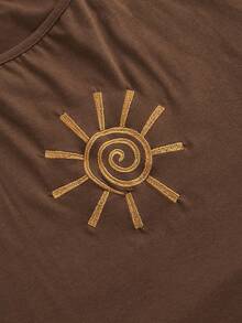 Hippie T-shirt a maniche corte con stampa di sole alla moda per donne con collo all"americana