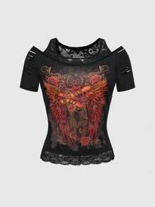 Hippie Maglietta 2 in 1, vintage in stile Y2K con stampa di rose e ali, contrasto di pizzo