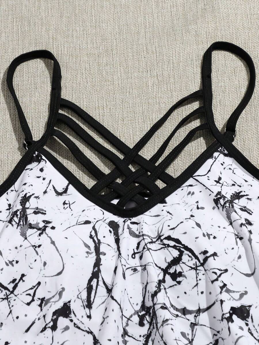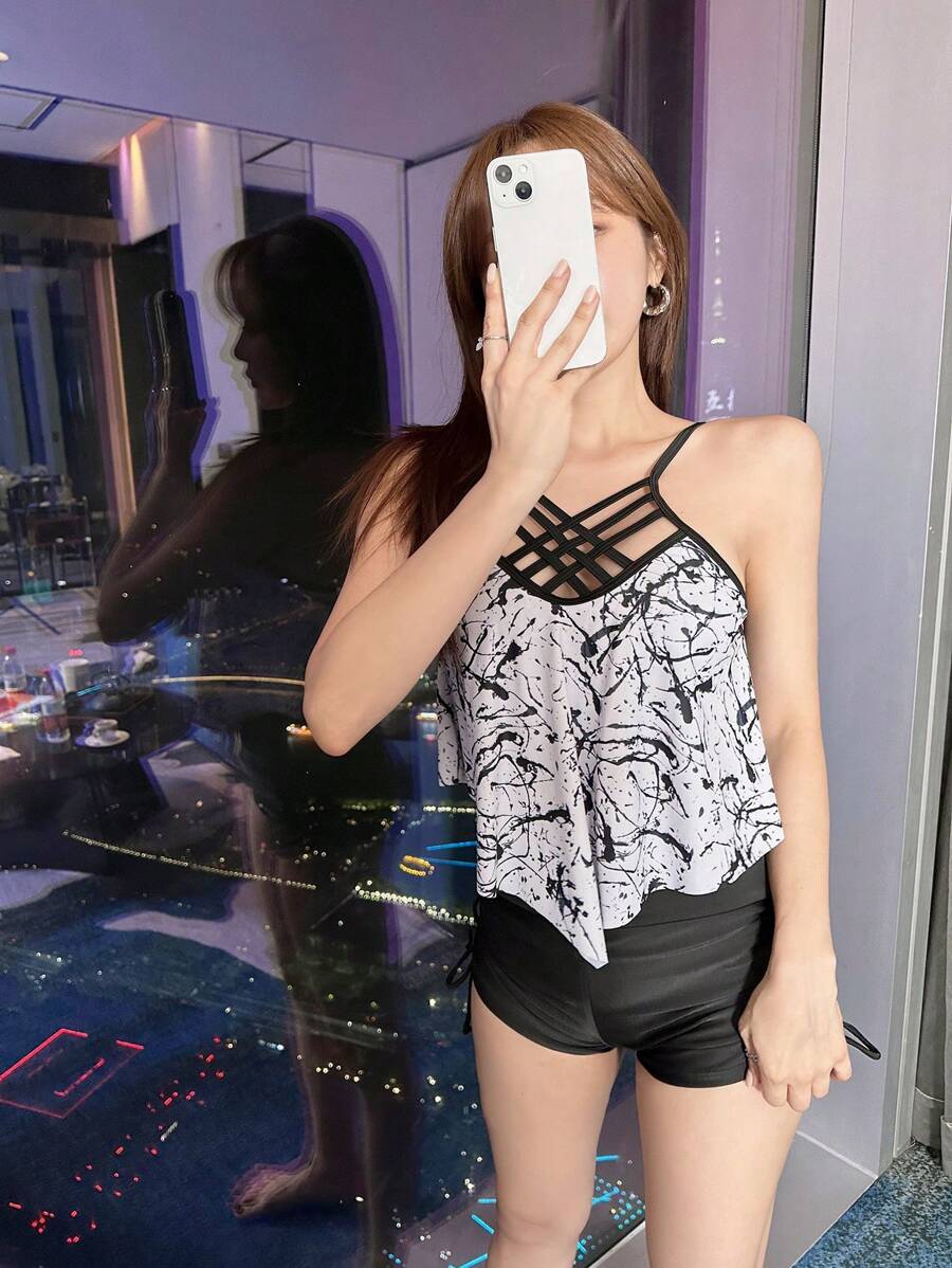 ink painting Tankini Set con orlo asimmetrico incrociato reticolo fluttuante Shorts & Top bretelle sottile 2 pezzi Costume da bagno