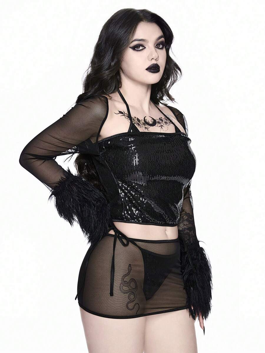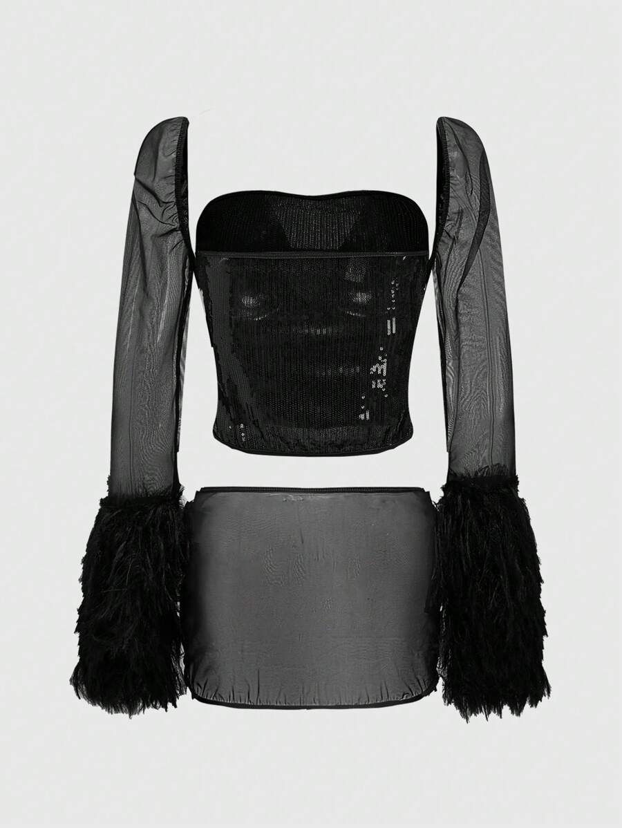 J-Fashion 4 pezzi Reggiseno a balconcino con lacci glitterati, set di biancheria intima sexy e trasparente con maniche lunghe e polsini in pelliccia