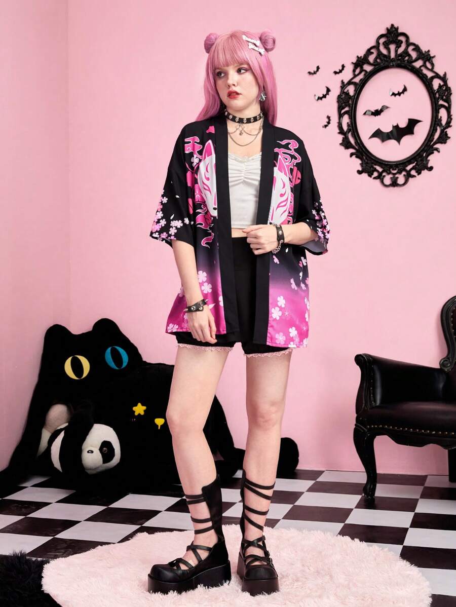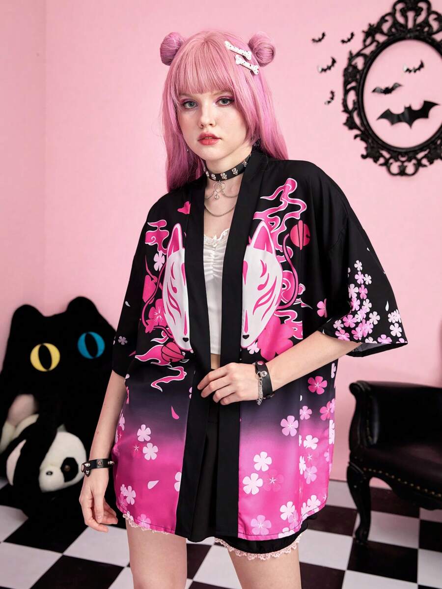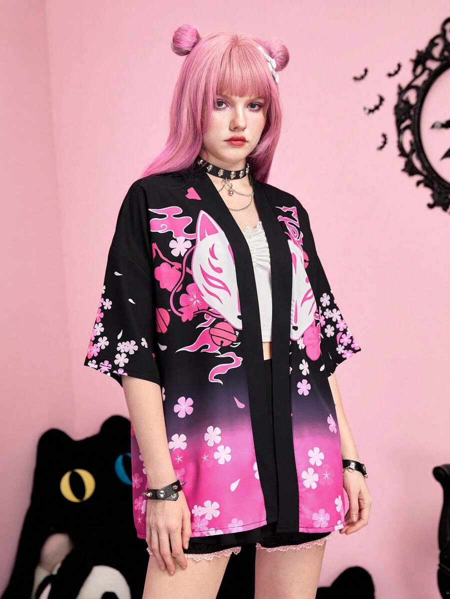 J-Fashion Kimono con grafica fumetto sfumato spalle cadenti