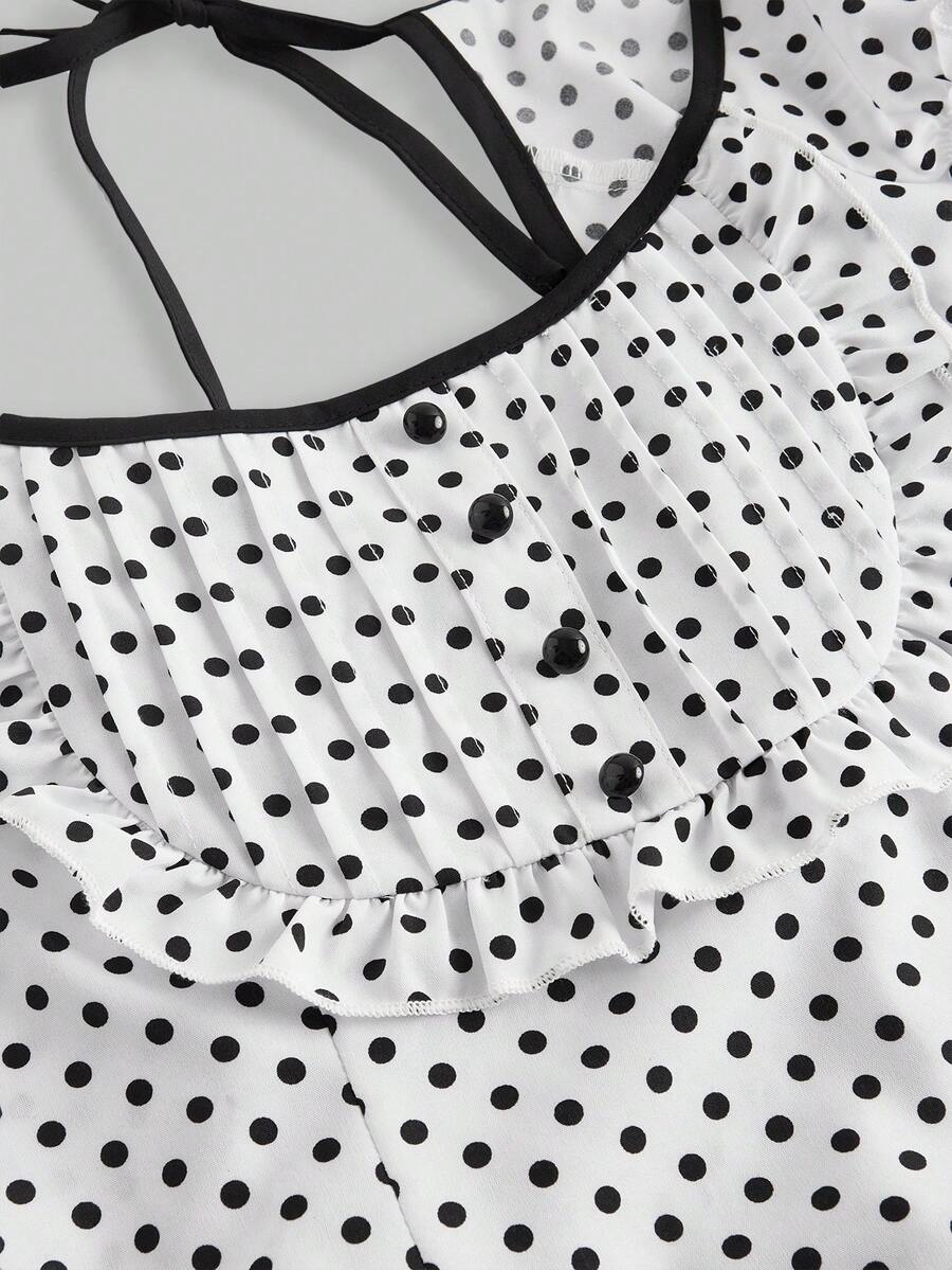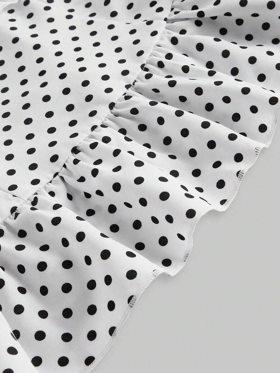 J-Fashion Blusa in stile giapponese da donna con collo tondo, orlo increspato, maniche a palloncino, vita stretta, a pois bianchi