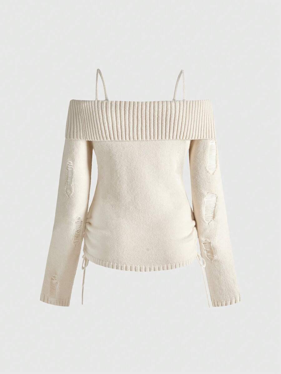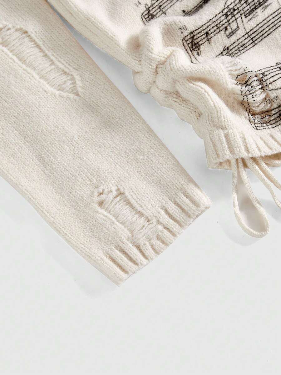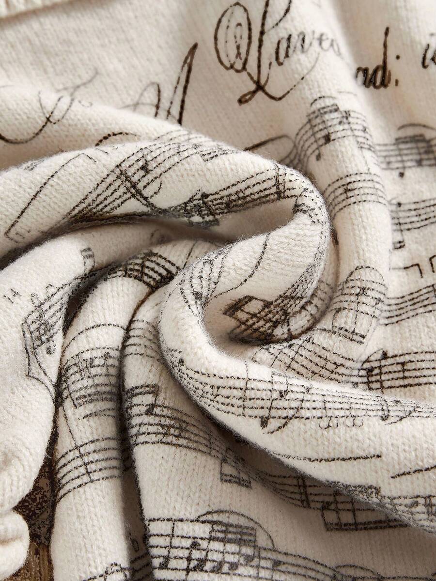 Maglione da donna con stampa di note musicali a spirale, stile J-Fashion, spalle scoperte, effetto consumato, casual
