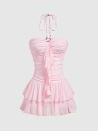 ROMWE Avant Abito mini aderente con scollo alla halter, balze a volant e stampa a pois, sexy