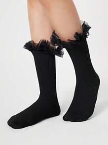 Kawaii 1 Paio Di Calze Alla Metà Del Polpaccio Nere In Rete Con Decorazione In Pizzo, Calze Alte Al Ginocchio Nervate Dolci, Calze Versatili In Stile Accademico Per Donne