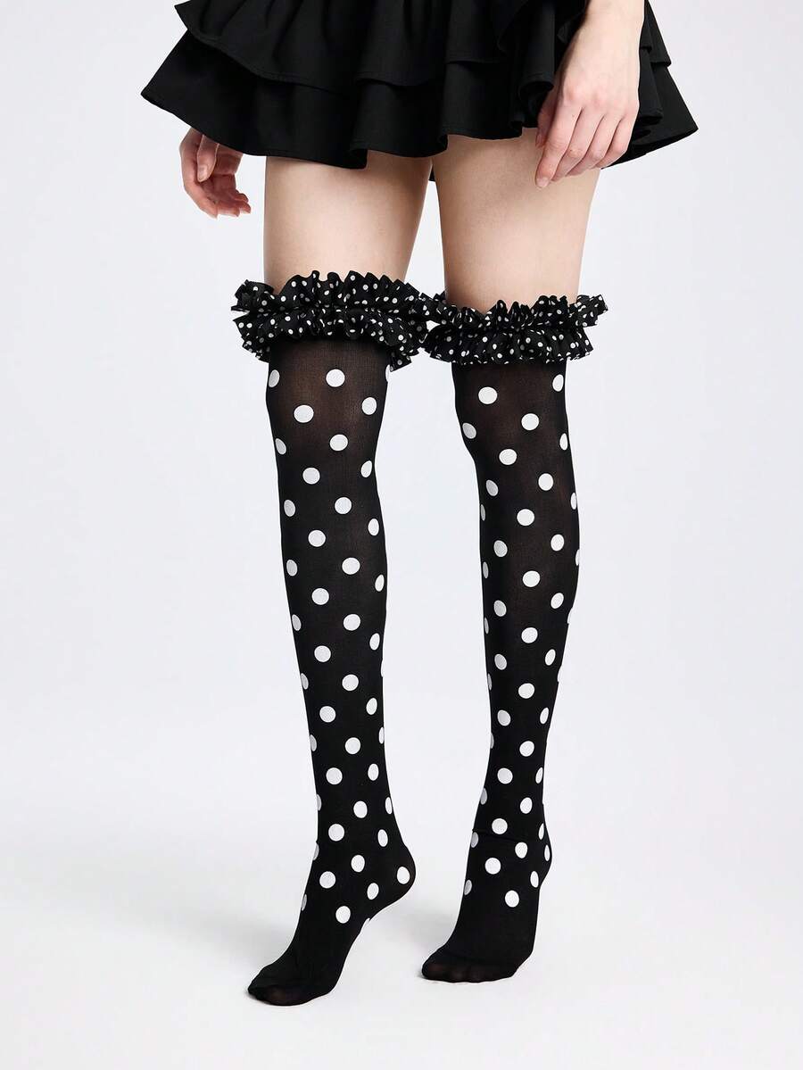 Kawaii 1 Paio di Calze al Ginocchio con Balze a Pois Bianchi e Neri per Donna