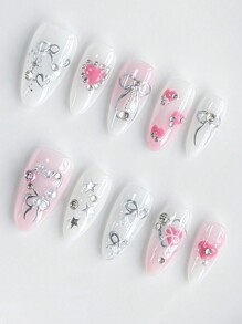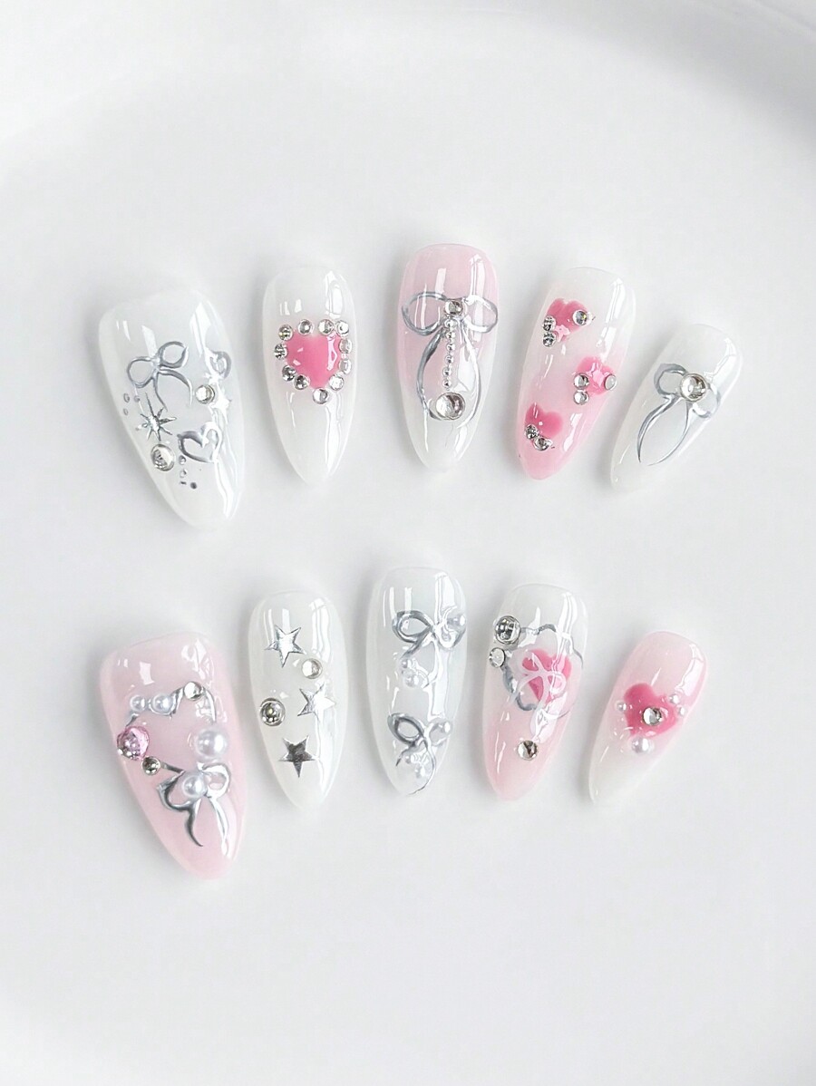 Kawaii 10 pezzi Adorabile Stile Unghie False Fatte A Mano Con 3 Fogli Di Nastro Biadesivo, Decorazioni Rimovibili Con Fiocchi Y2K Dipinti A Mano E Strass Colorati Di Alta Qualità, Adatto Per Festival, Feste, Ballo E Uso Quotidiano