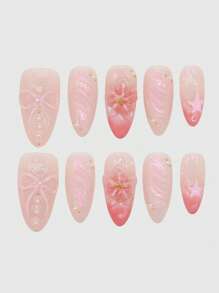 Kawaii 10 pezzi di unghie finte rosa con stampa in rilievo, di alta qualità, fatte a mano + 3 fogli di adesivi biadesivi, decorazioni per unghie con farfalle dolci, adesivi per unghie rosa con specchio staccabile e dipinti a mano, adatti per vacanze, feste, ballo e uso quotidiano