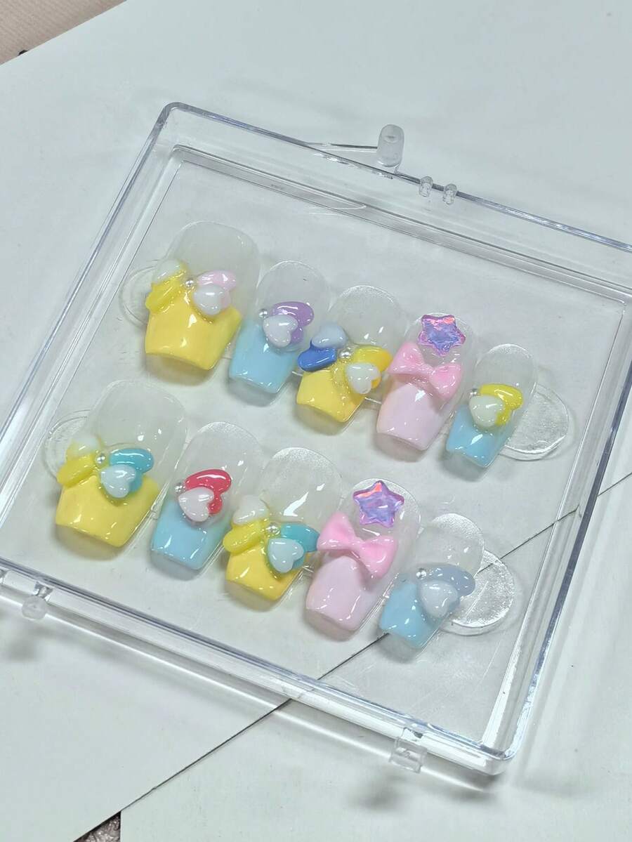 Kawaii 10 Pezzi/set Unghie Finte Lunghe, Stile Francese A Gradiente Con Cuore & Design Con Fiocco Regalo Con Colla Gelatina