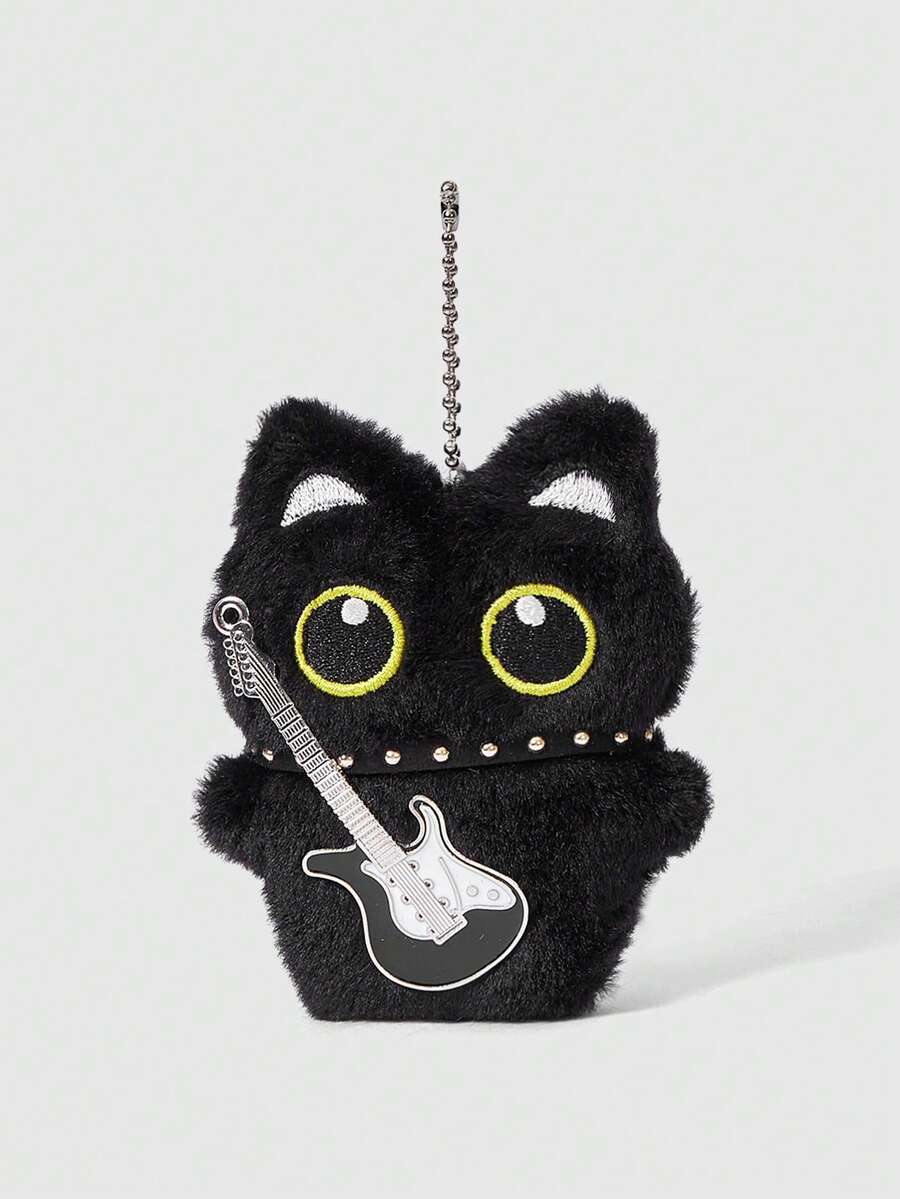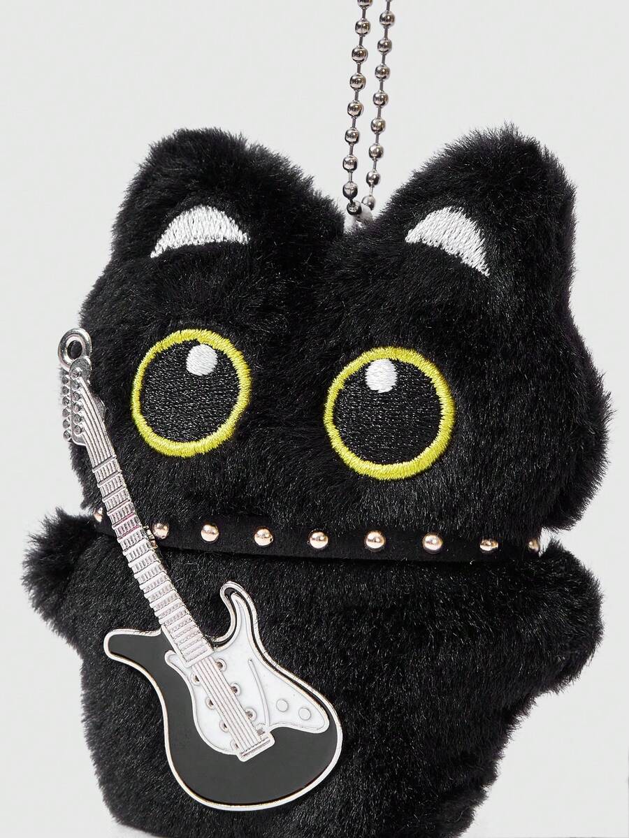 Kawaii 1 pezzo Collana con ciondolo a forma di chitarra in stile retrò punk in peluche nero, accessorio multifunzione a forma di gatto nero - portachiavi, charm per borse, può essere appeso a borse, pantaloni, adatto per uso quotidiano, campus, shopping, appuntamenti, ecc.