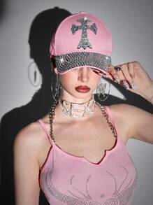 Kawaii 1 berretto da baseball con strass a forma di croce, stile Y2K, design rosa, snapback casual, accessorio alla moda per uso quotidiano e streetwear