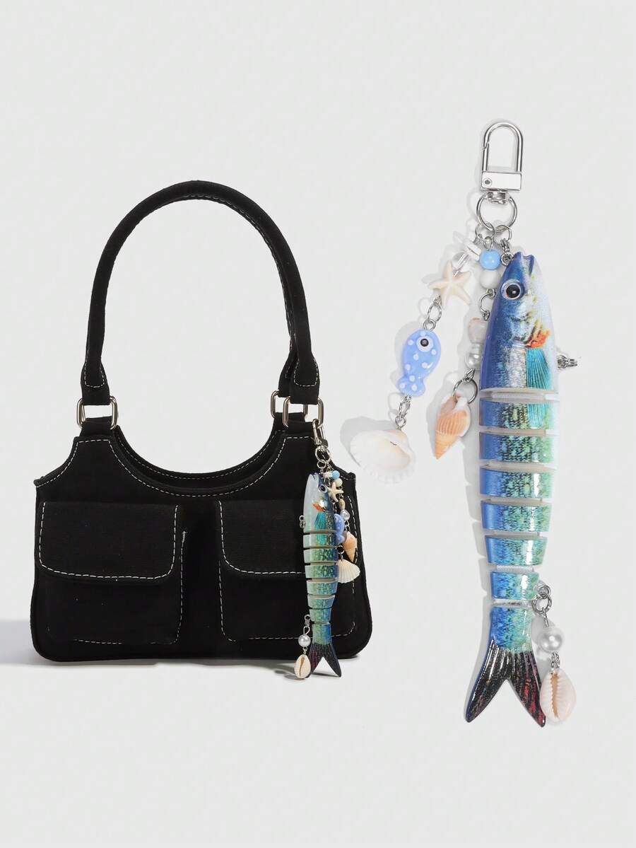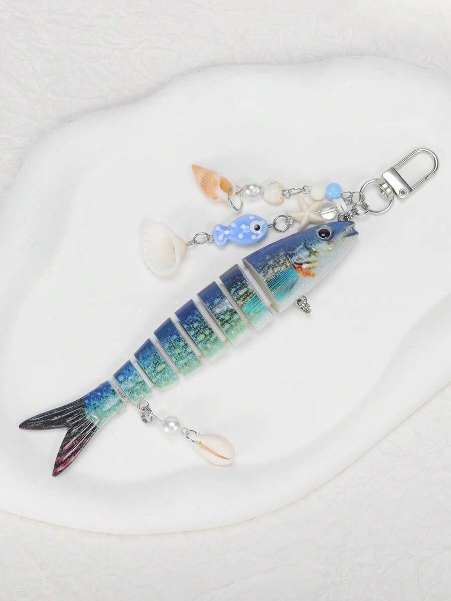 Kawaii 1 pezzo Portachiavi fatto a mano a forma di conchiglia e pesce, esca da pesca bionico, ciondolo a forma di gancio per pesca multisezione in stile vacanza/oceano