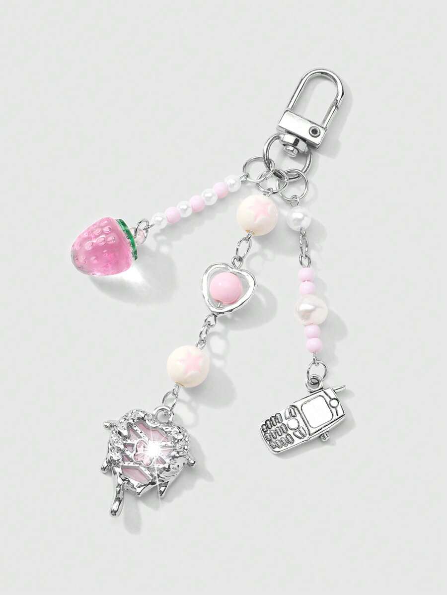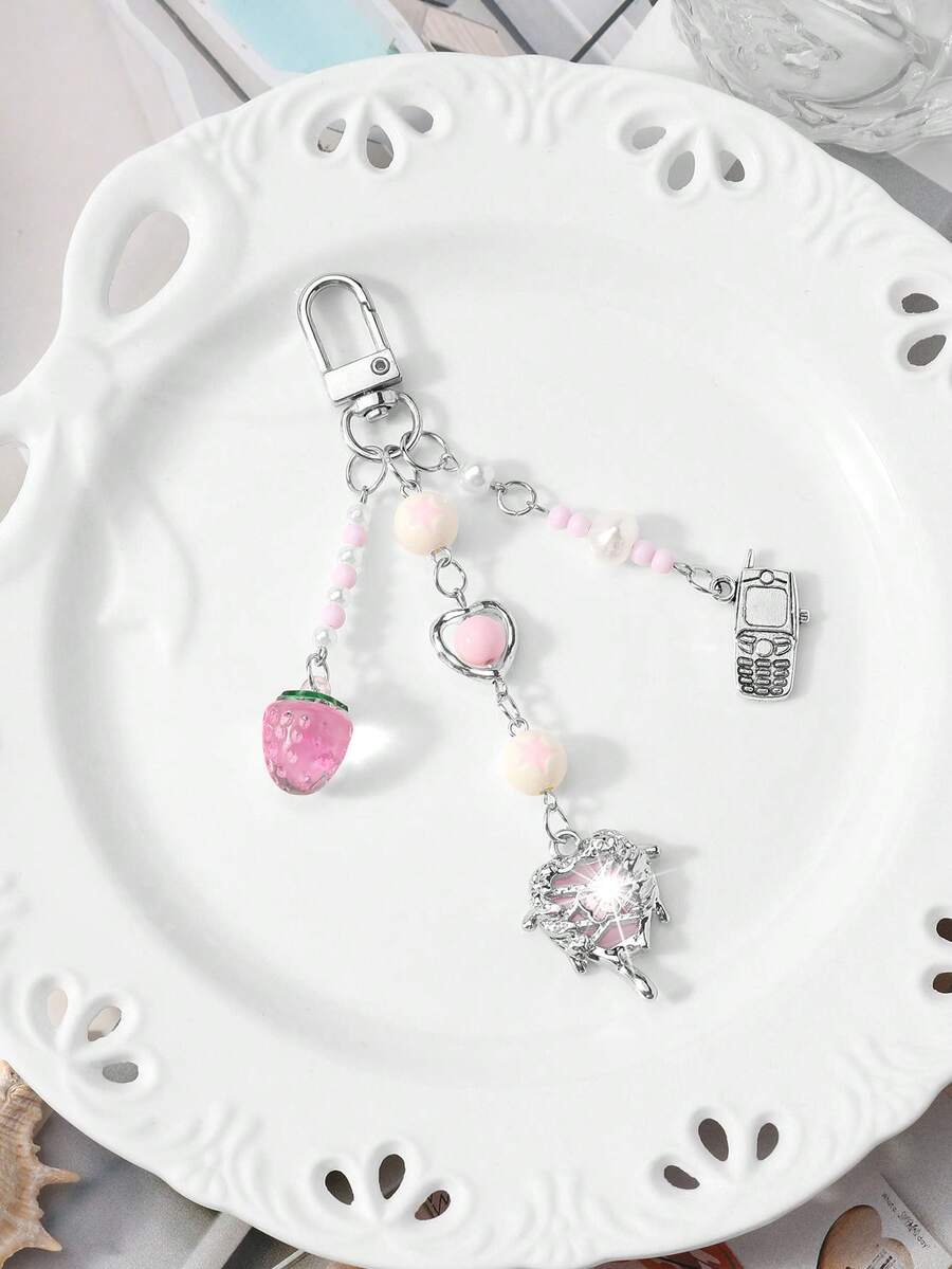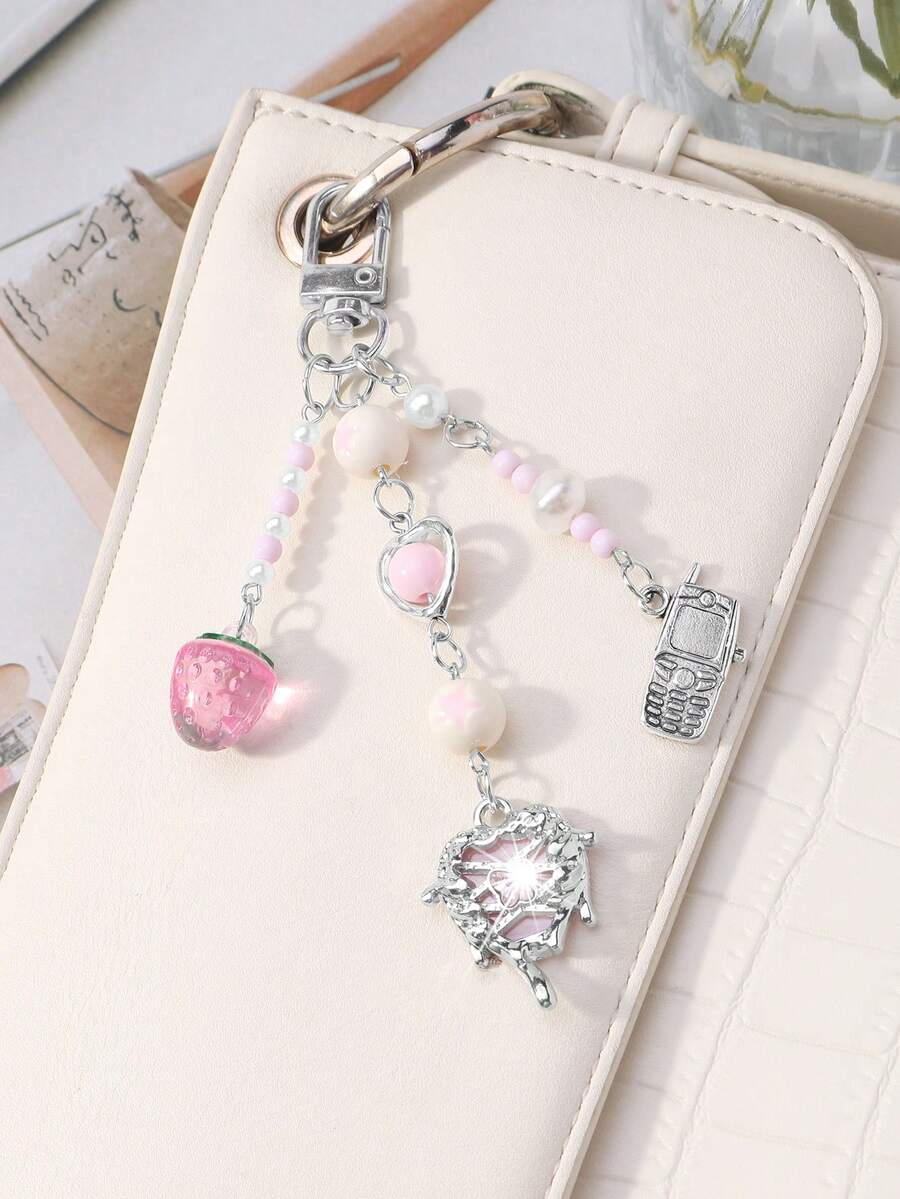 Kawaii 1 pezzo Ciondolo per telefono, portachiavi o borsa, stile accademico minimalista e carino, con catena d'argento, perle finte e cristalli, a forma di stelle, fragole e fiocco, adatto per le donne, per uso quotidiano o come regalo di San Valentino