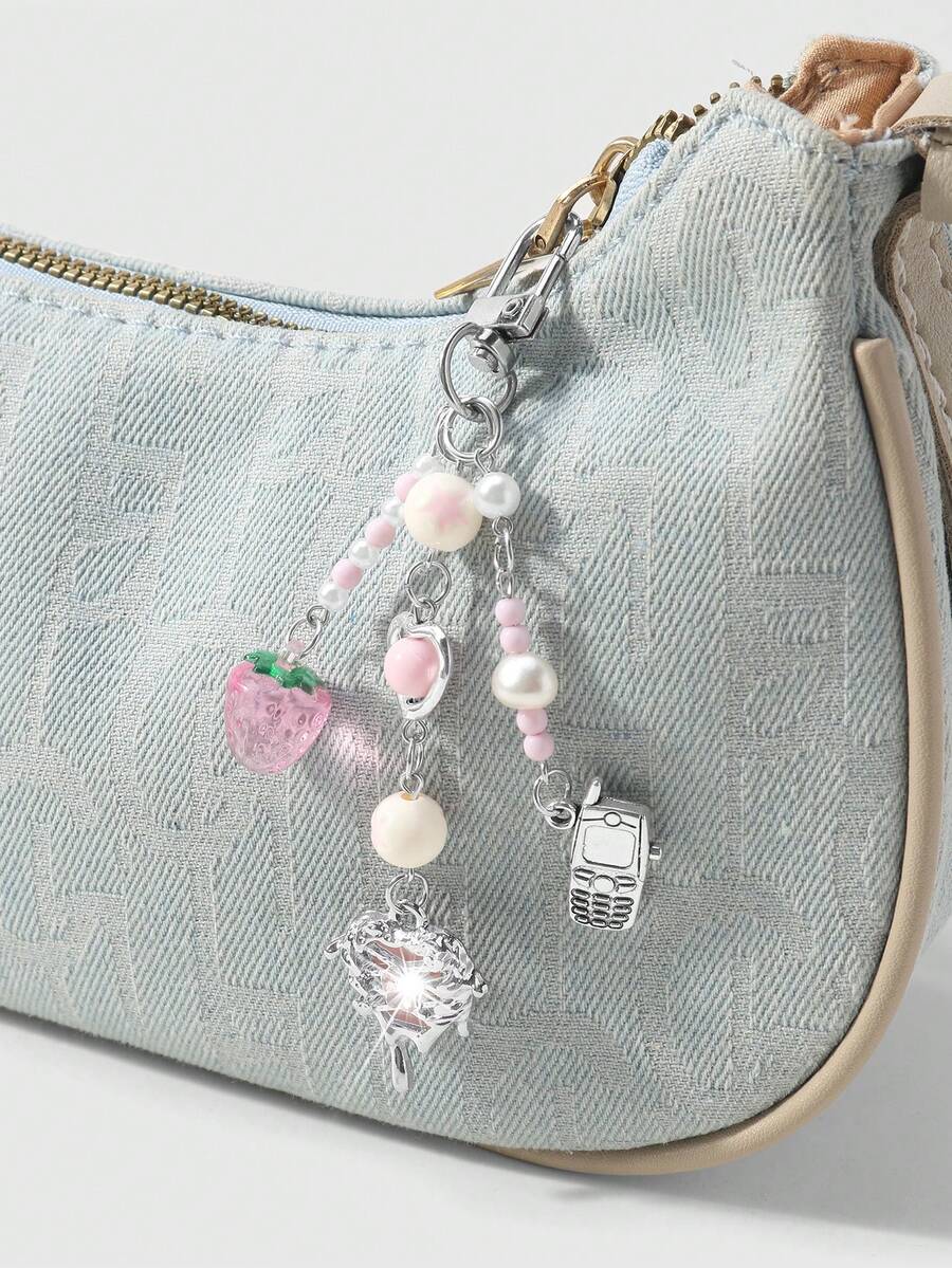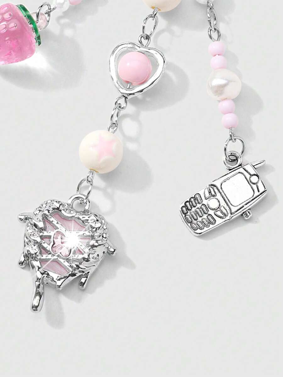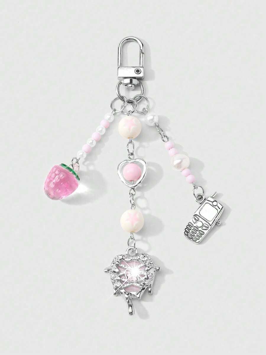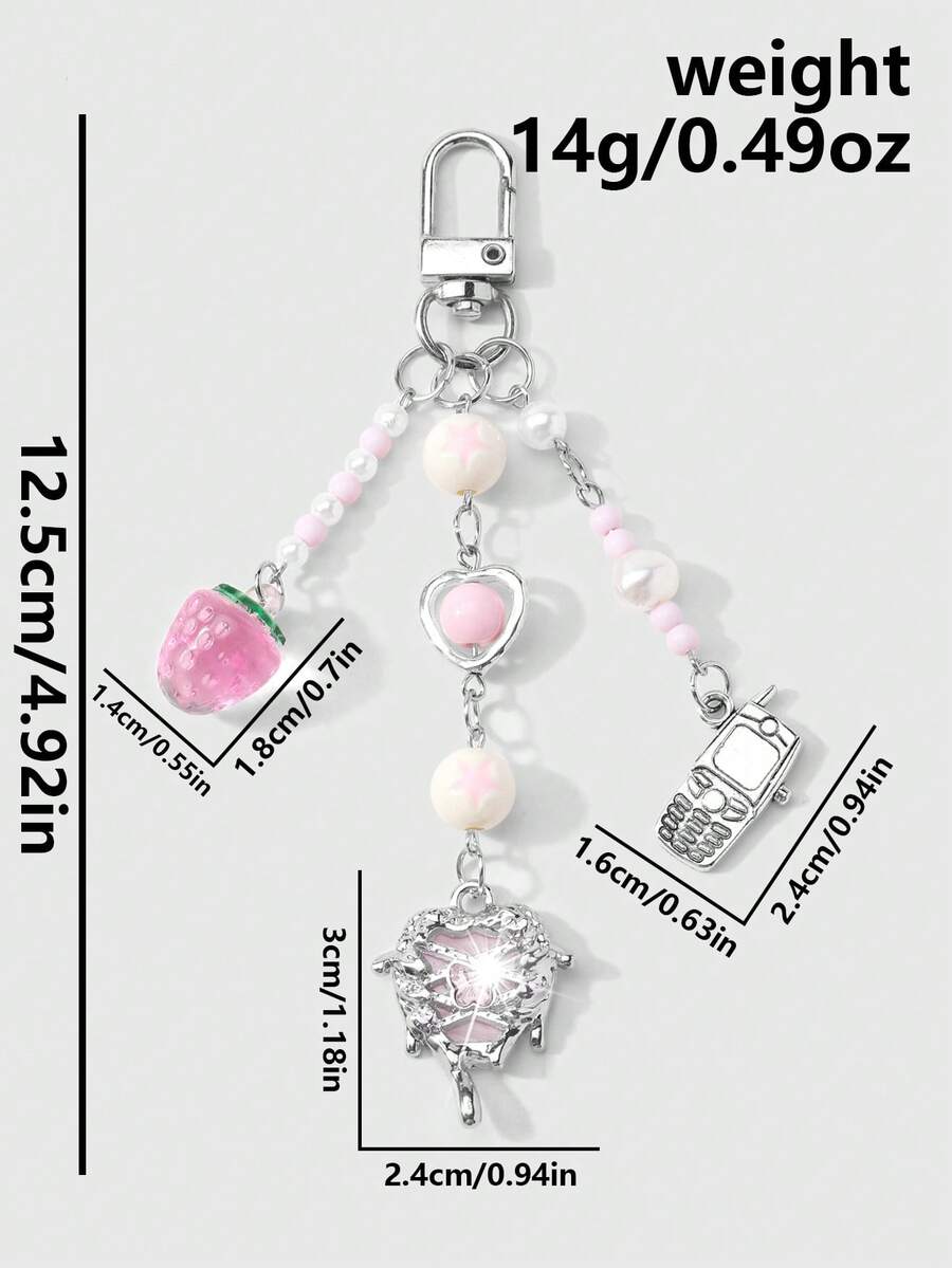 Kawaii 1 pezzo Ciondolo per telefono, portachiavi o borsa, stile accademico minimalista e carino, con catena d'argento, perle finte e cristalli, a forma di stelle, fragole e fiocco, adatto per le donne, per uso quotidiano o come regalo di San Valentino