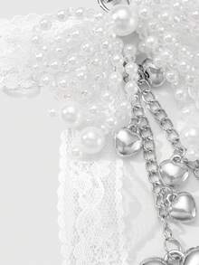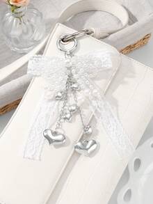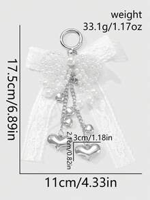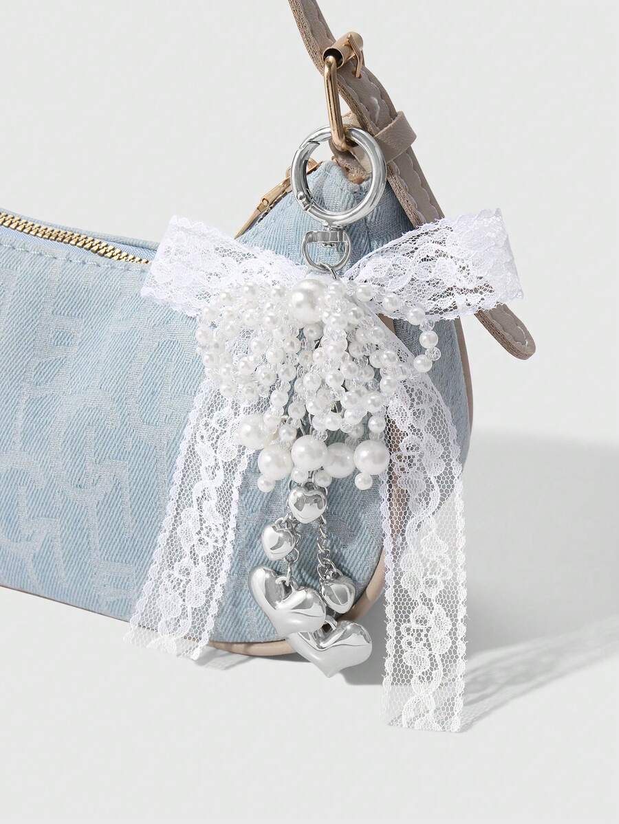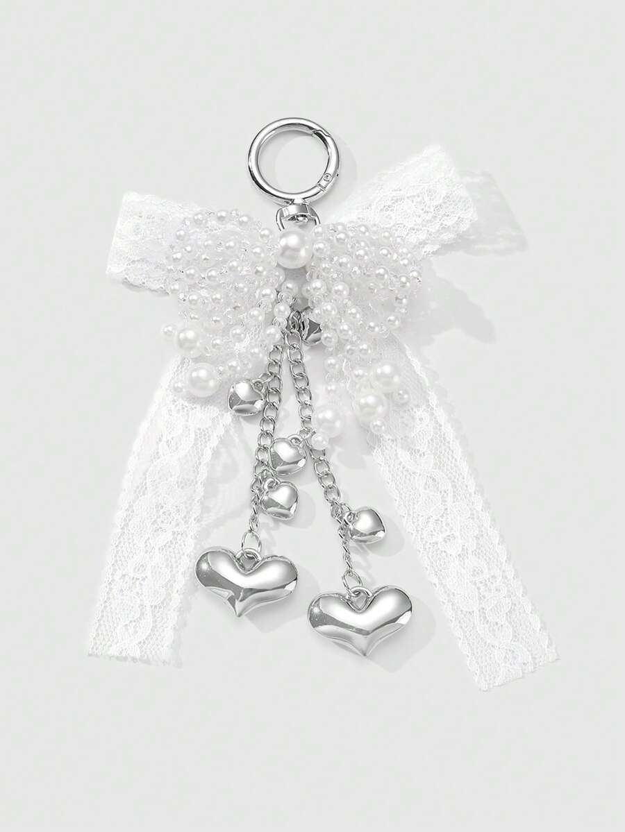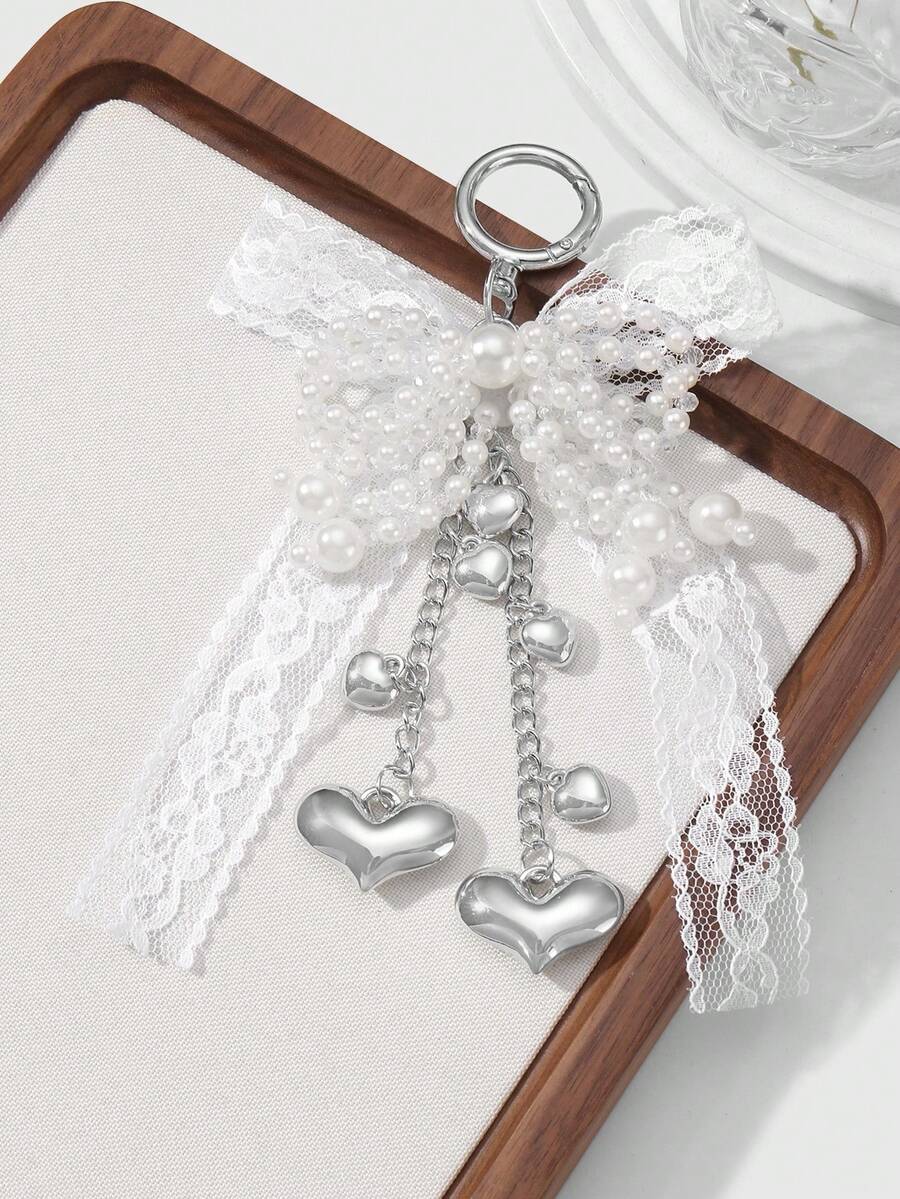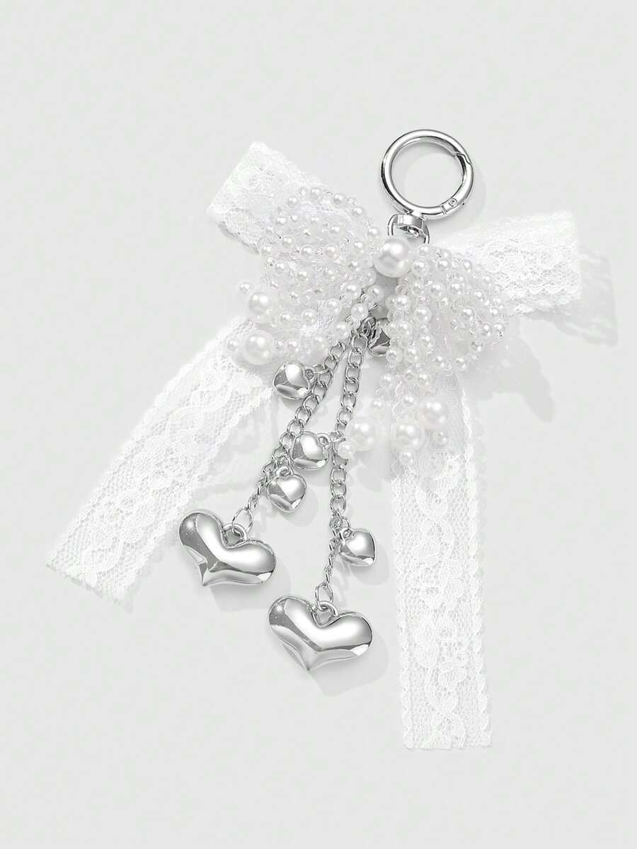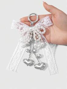 Kawaii 1 pezzo Portachiavi/ciondolo per borsa fatto a mano in stile retrò con perle bianche, fiocco in pizzo rosa e nero, catena a più strati con cuore e stella in CCB, elegante e di stile, adatto per donne/ragazze, ottimo regalo