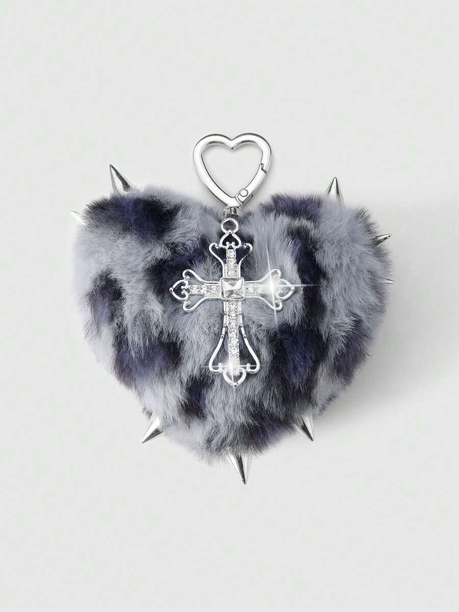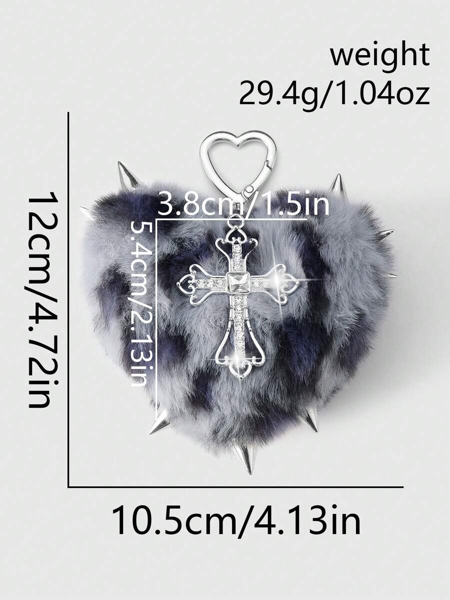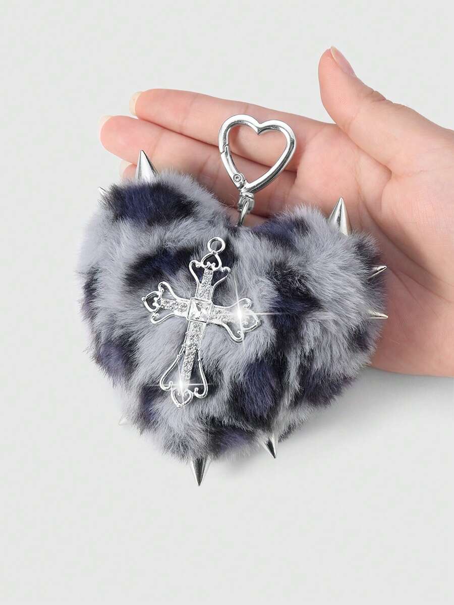 Kawaii 1 pezzo Ciondolo portachiavi Y2K retrò chic punk di alta qualità, con stampa animalier in pelliccia sintetica grigia, rivetti, cuore 3D in cristallo e croce cava, adatto per le donne, uso quotidiano, regalo per le vacanze