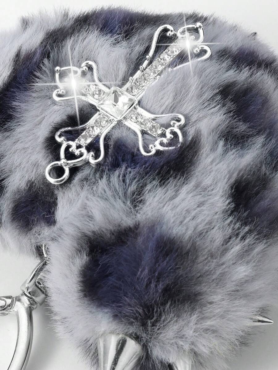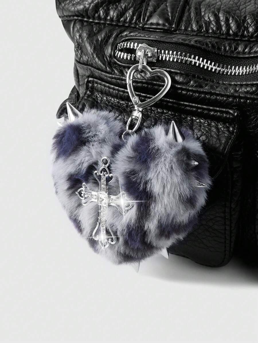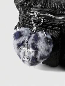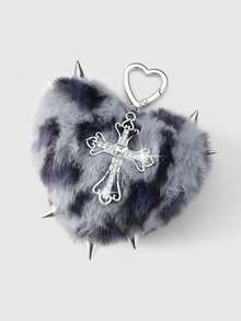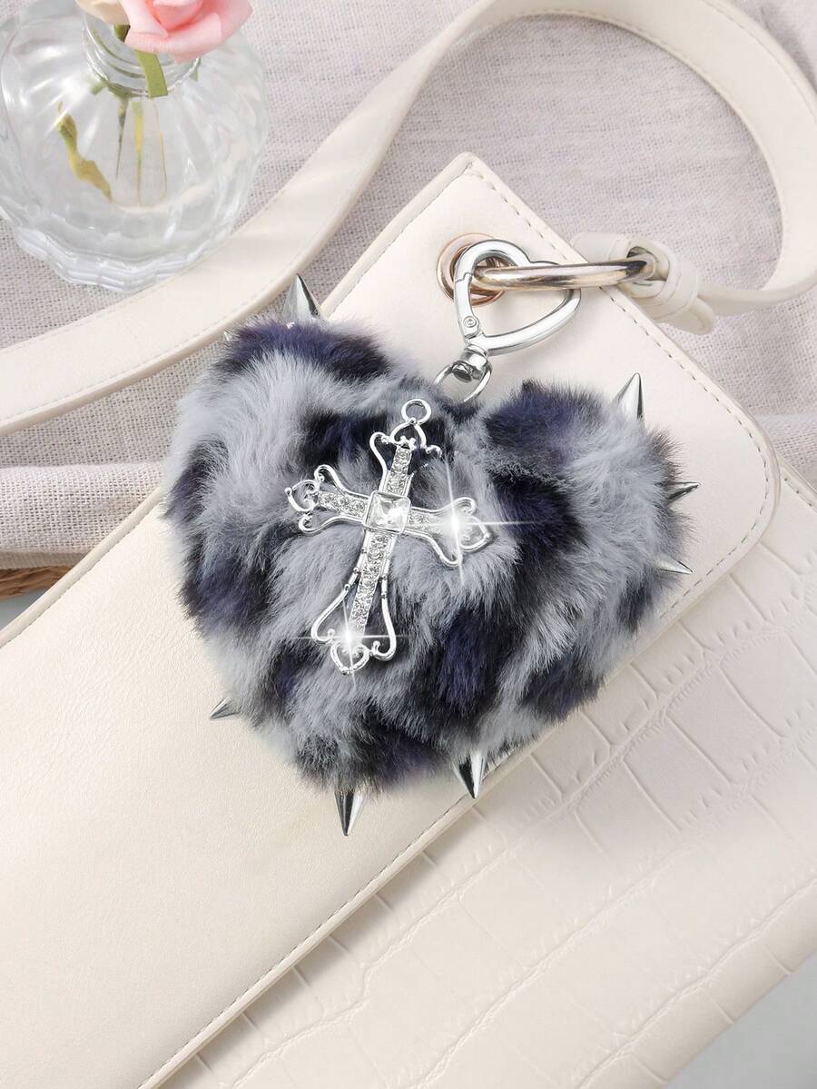 Kawaii 1 pezzo Ciondolo portachiavi Y2K retrò chic punk di alta qualità, con stampa animalier in pelliccia sintetica grigia, rivetti, cuore 3D in cristallo e croce cava, adatto per le donne, uso quotidiano, regalo per le vacanze