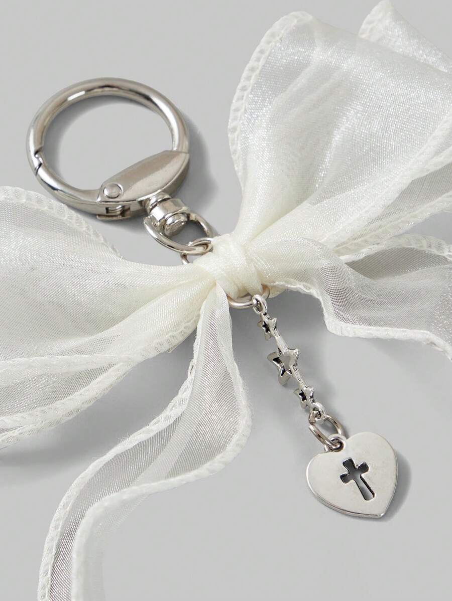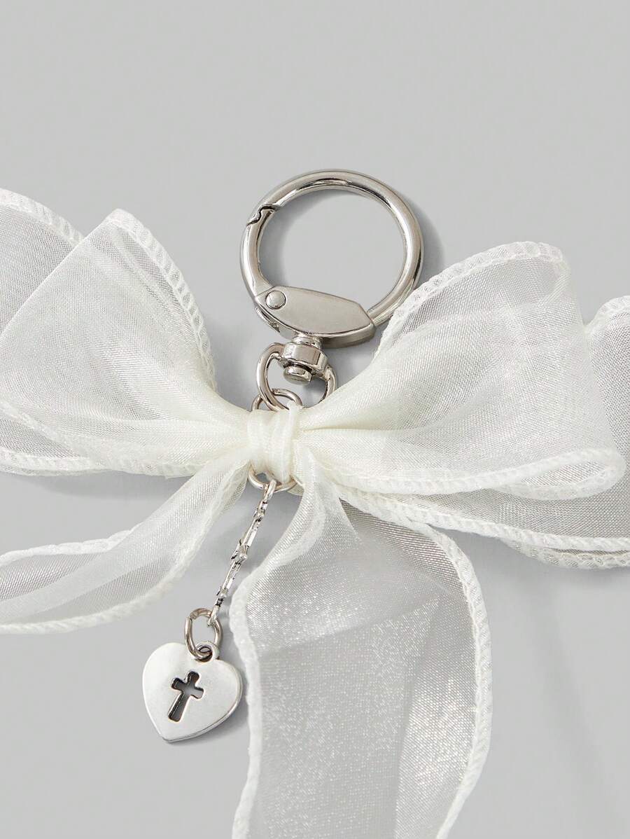Kawaii 1 pezzo Portachiavi/Charm da borsa con fiocco in organza, cuore in perla e croce, in stile Y2K