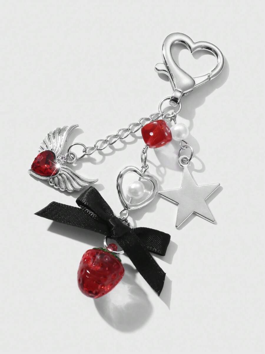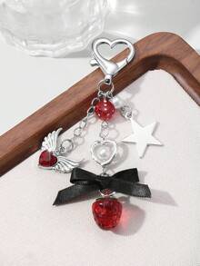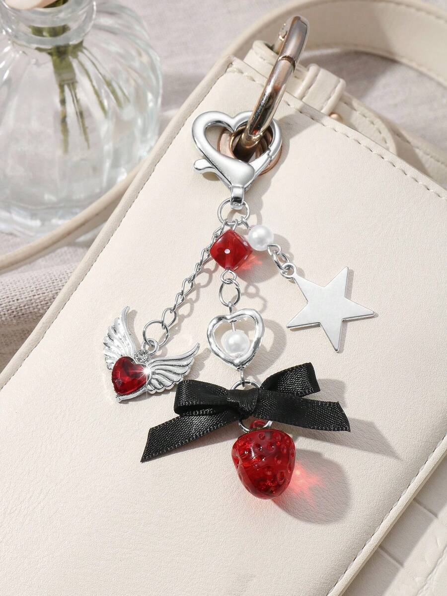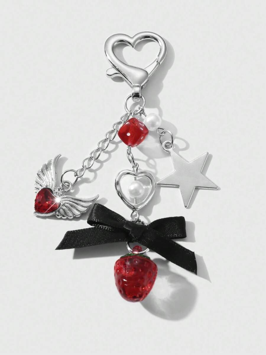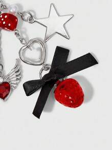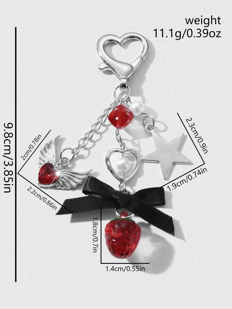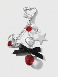 Kawaii 1 pezzo Portachiavi stile gotico alla moda Y2K, con catena d'argento, ali, cuore di cristallo, fiocco e fragola in resina, adatto per uso quotidiano di donne/ragazze, regalo per vacanze, Ognissanti