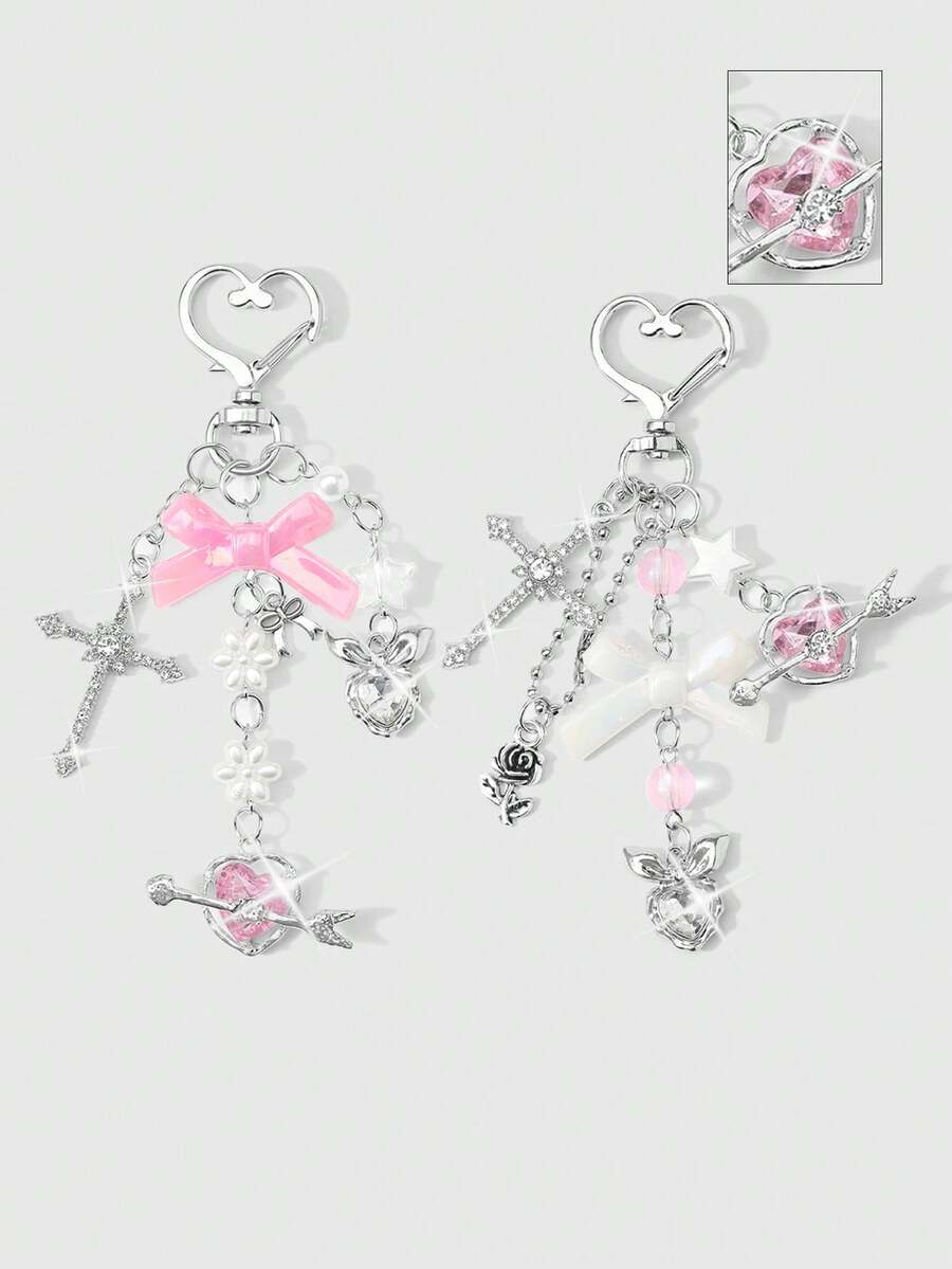 Kawaii 2 nuovi set di accessori alla moda versatili e semplici di alto valore, stile college, con fiocco rosa in acrilico, imitazione di perle, fiocco di neve, rosa, orecchie di coniglio, freccia attraverso il cuore piena di diamanti, ciondolo a forma di croce, adatto per sorelle e fidanzate per uso quotidiano e regali per le vacanze