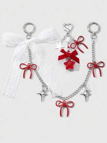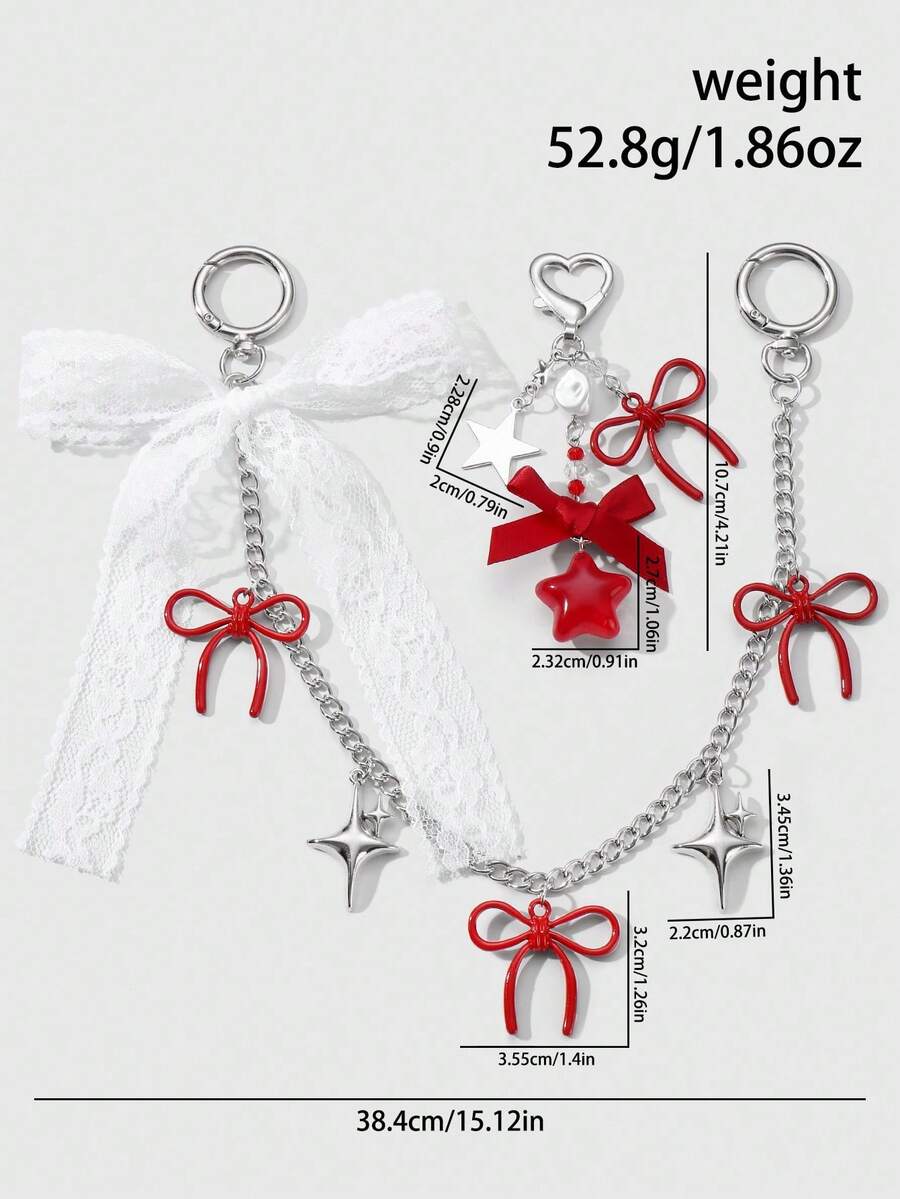 Kawaii 2 pezzi Set di portachiavi/pendenti eleganti e alla moda con farfalla in pizzo, catena a forma di stella e cuore in resina con farfalla rossa in pizzo, accessorio versatile e alla moda, idea regalo per donne