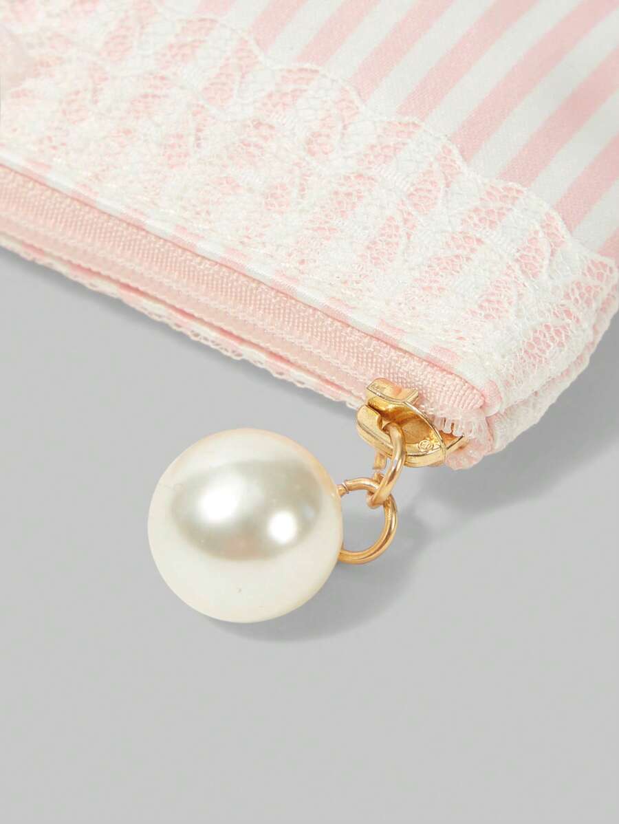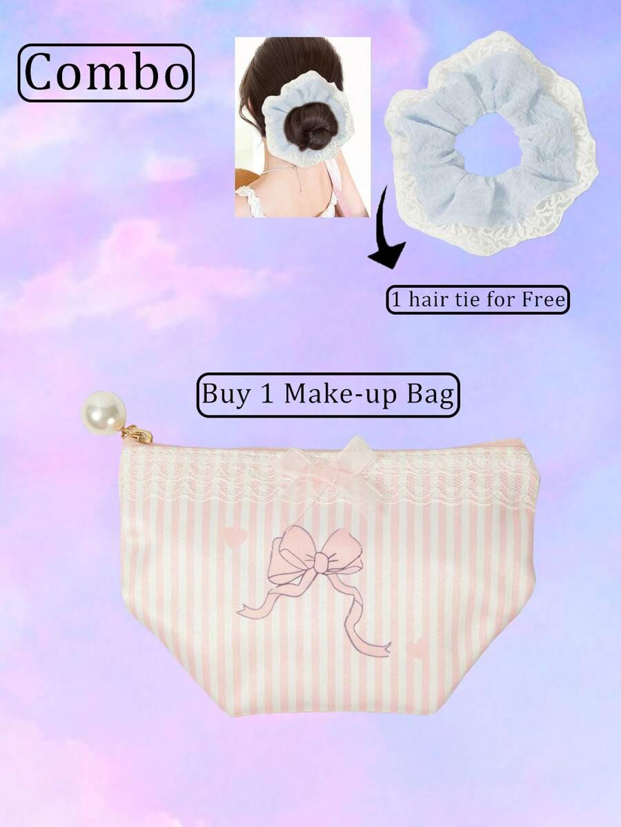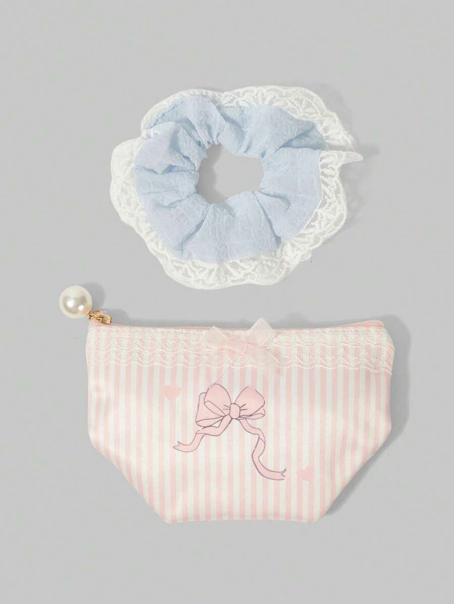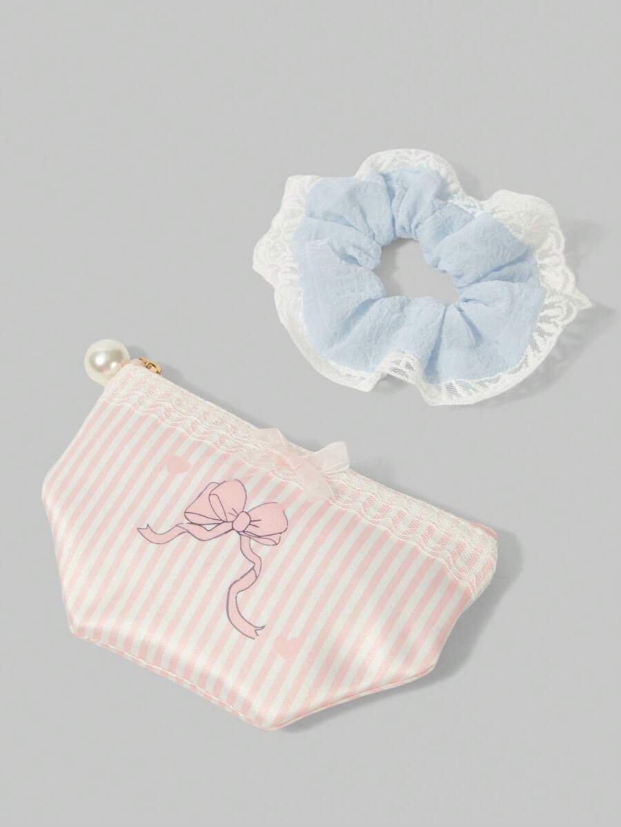 Kawaii 2 pezzi/set Borsellino portatile/borsa cosmetici con decorazione in pizzo, rosa a righe, a forma di cuore e fiocco, con fermaglio per capelli