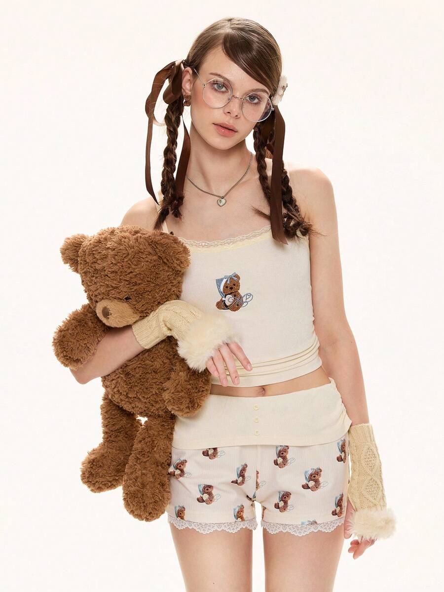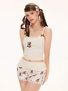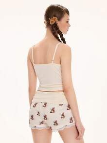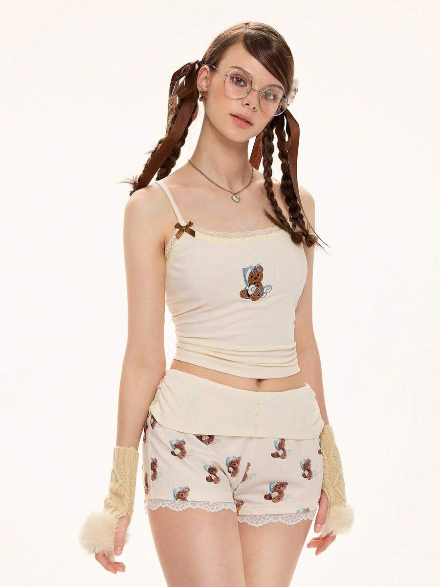 Kawaii 2 pezzi/set Pantaloncini mini aderenti da donna con stampa di orsetti carini, pizzo e fiocco