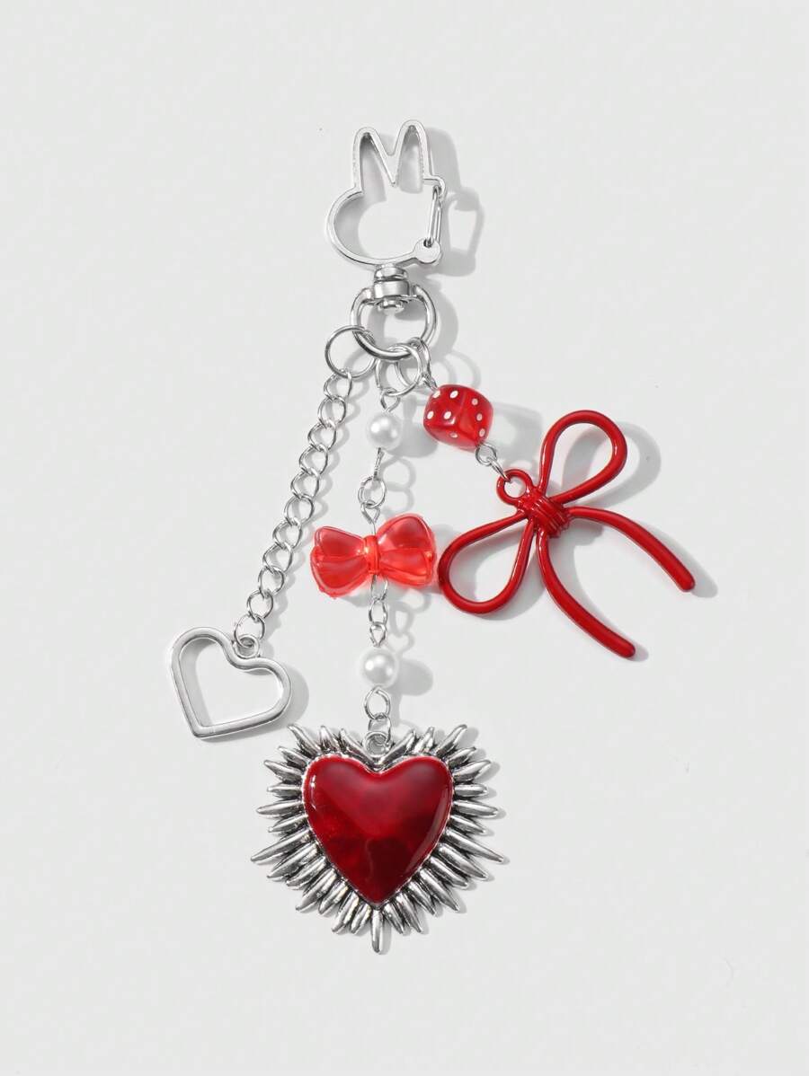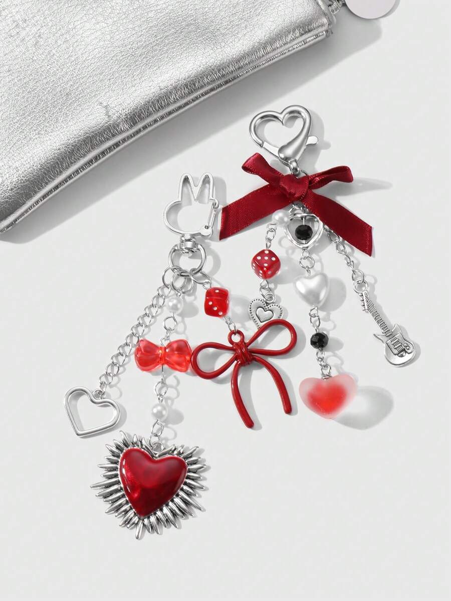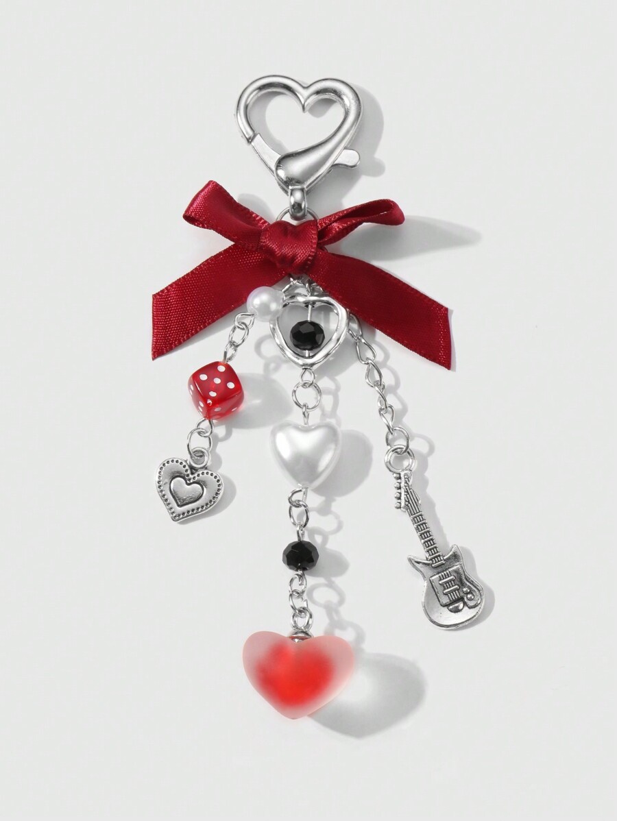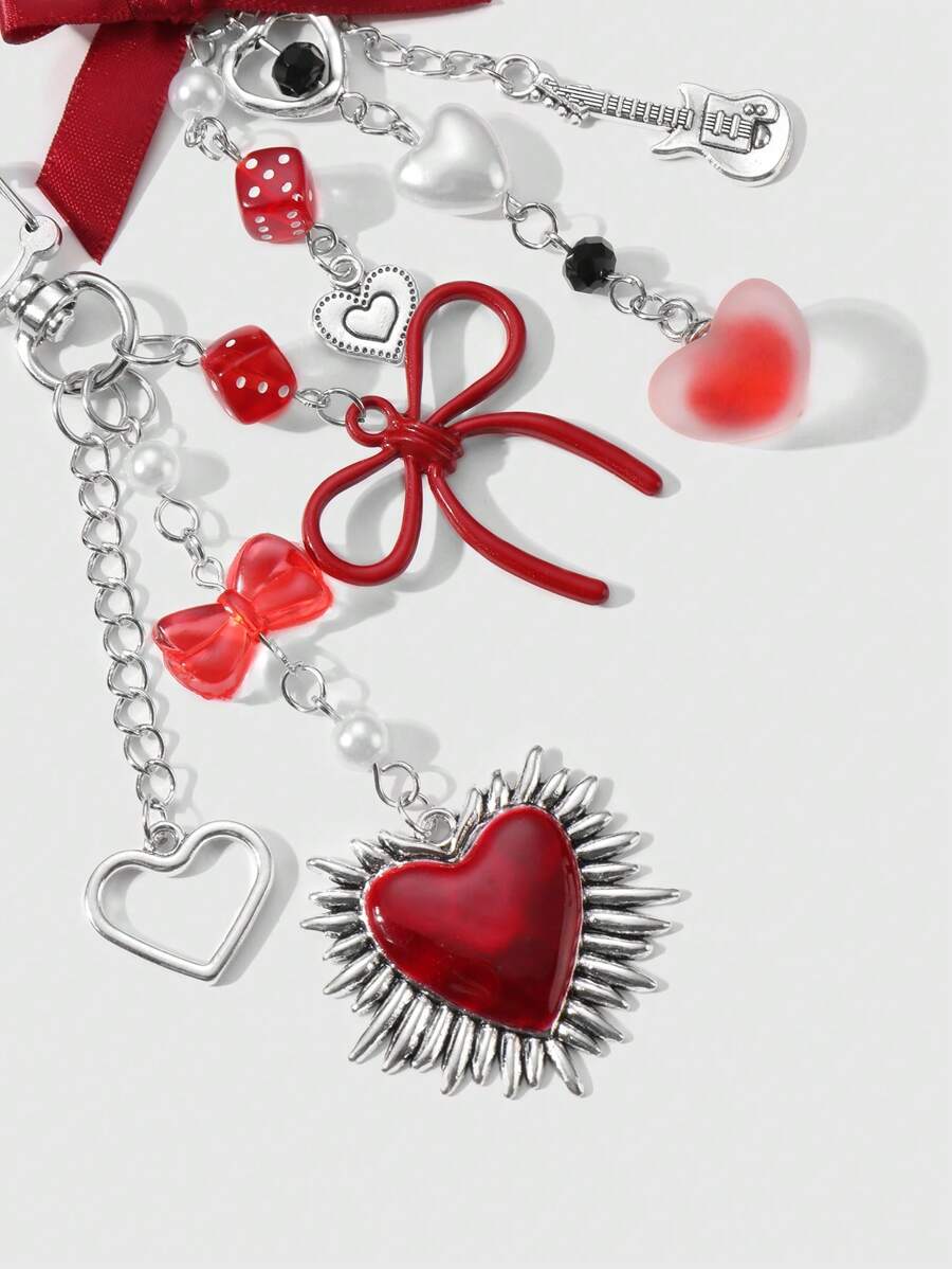 Kawaii 2 pezzi set di accessori alla moda in stile Y2K, ciondolo a forma di cuore in catena d'argento cava, perle finte rosse, nastrini e ciondoli a forma di chitarra cuore, adatti per donne/ragazze, uso quotidiano, regali di festival e San Valentino