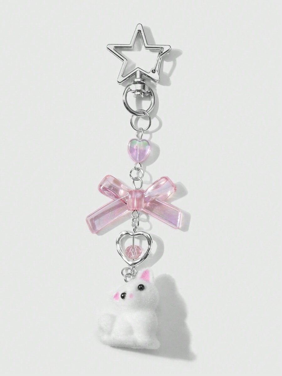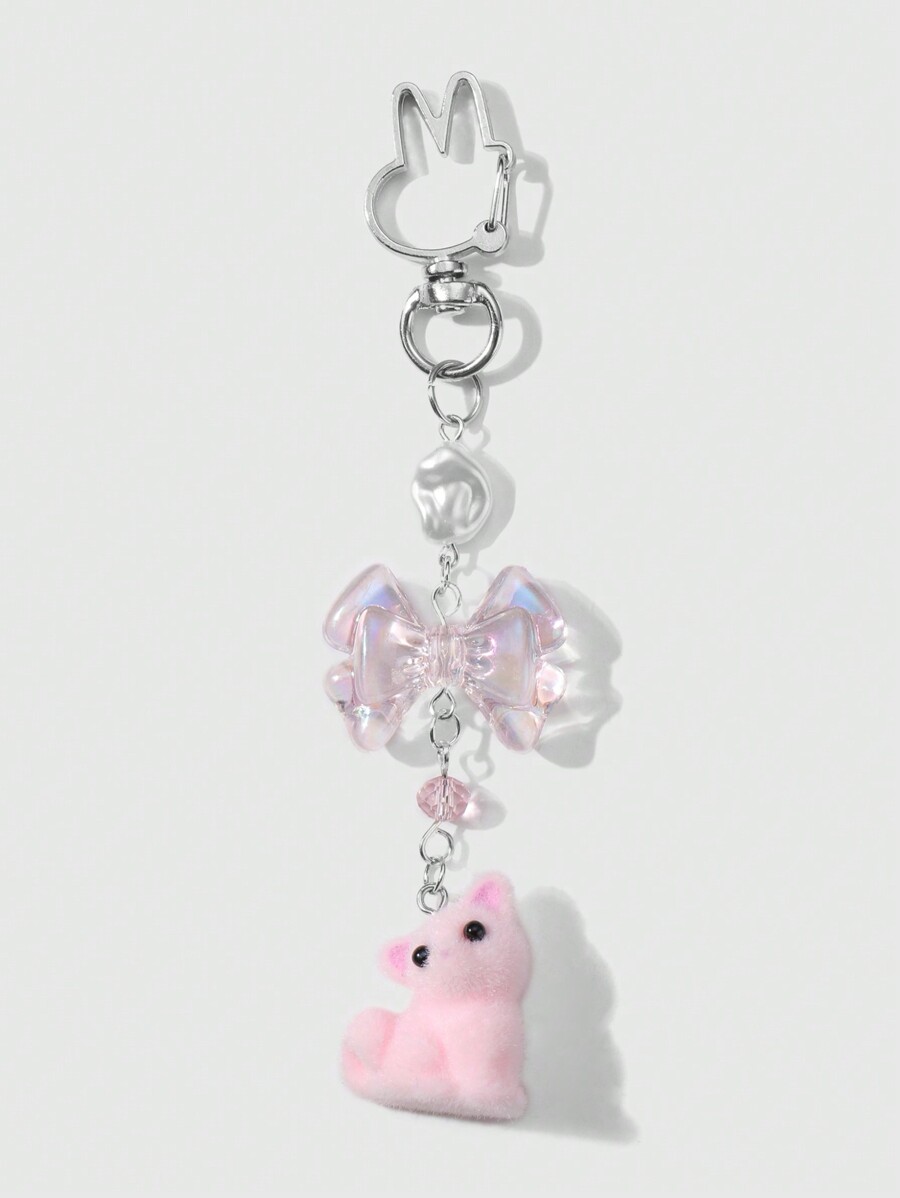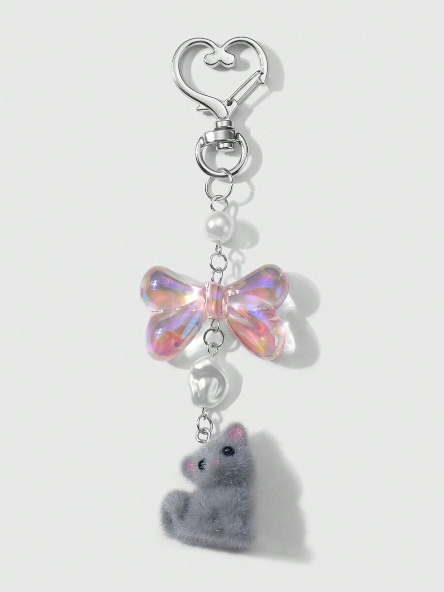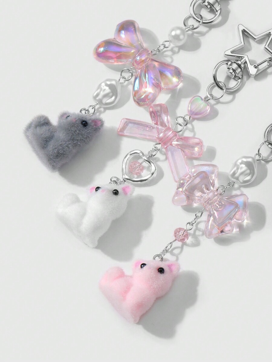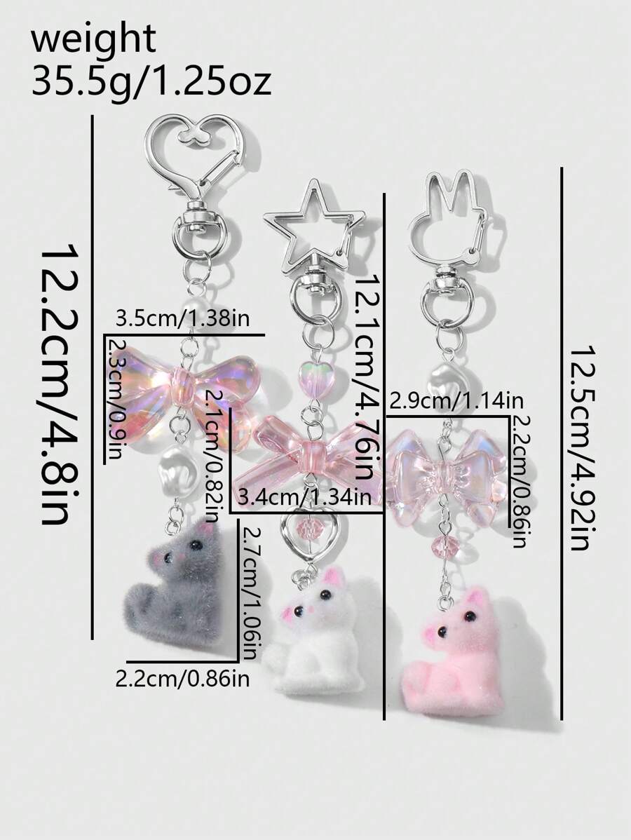 Kawaii Set di 3 pezzi composto da portachiavi con ciondoli in argento, perle, fiocchi trasparenti rosa, tessuto floccato bianco/rosa/grigio a forma di volpe, adatto per sorelle, fidanzate, amiche, per uso quotidiano e regali