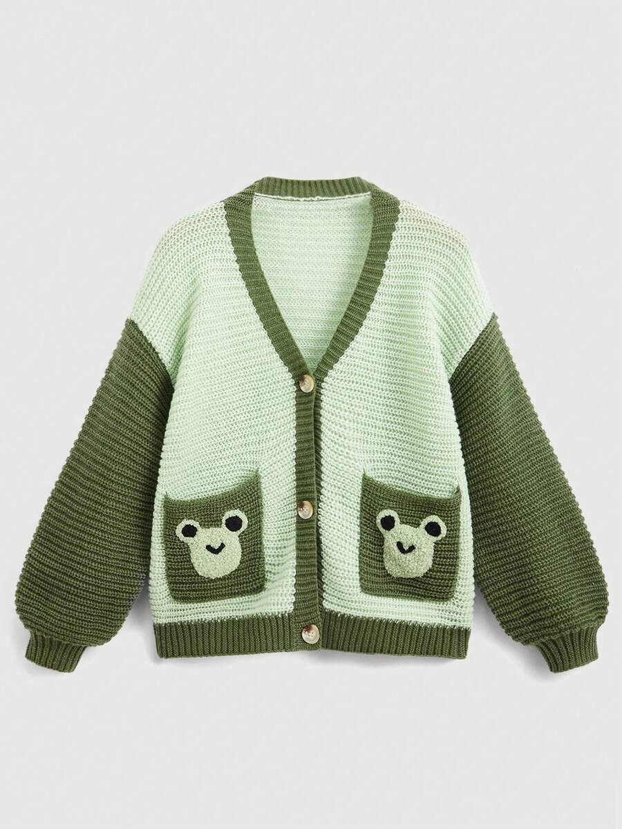 Kawaii Cardigan a goccia con spalle larghe con motivo a rana cartoni animati e blocchi di colore, adatto per la scuola