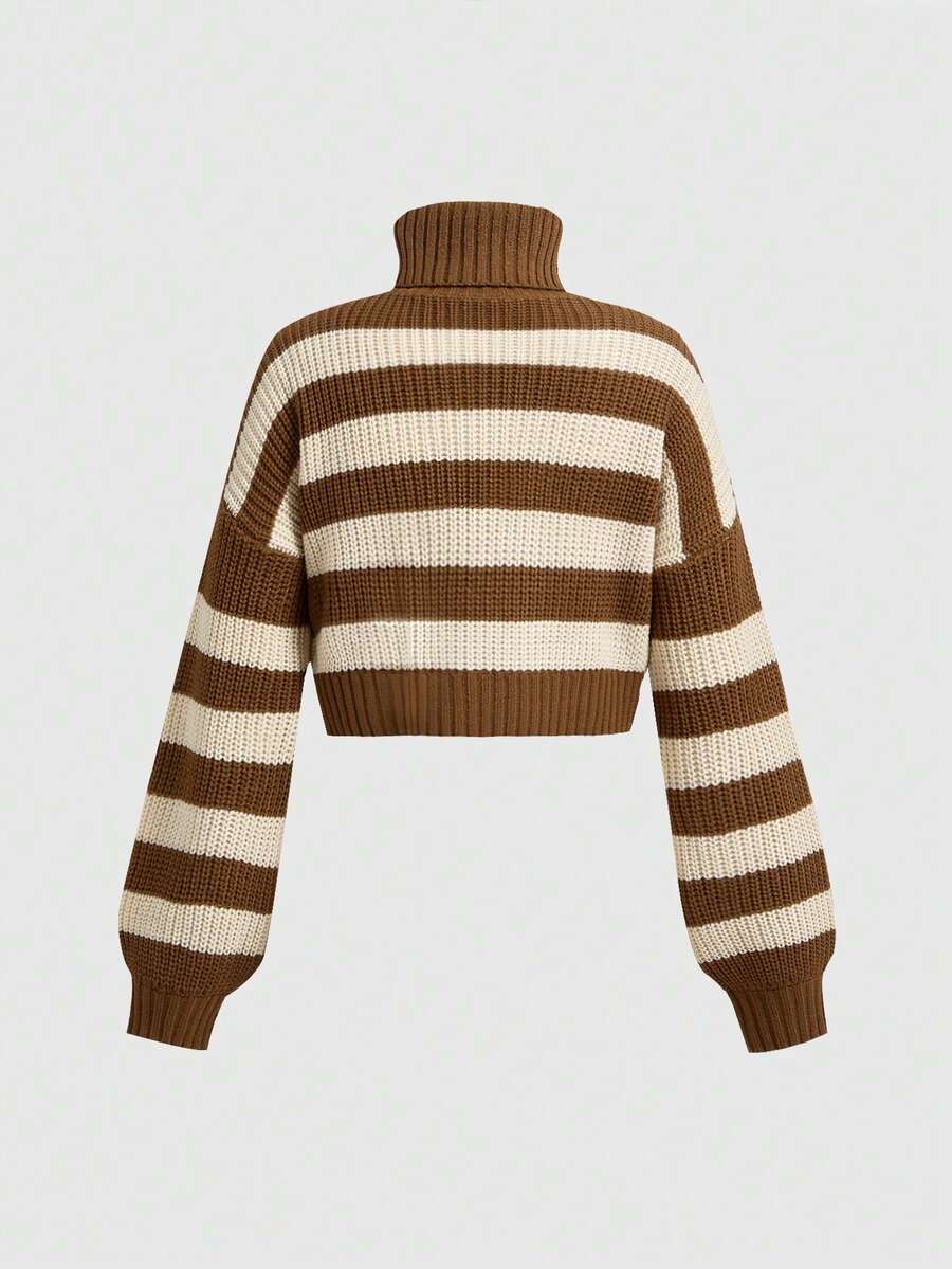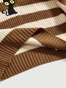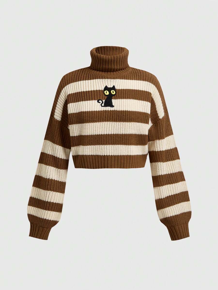 Kawaii Maglione a collo alto casual e carino con ricamo di gatto nero e righe per ragazze