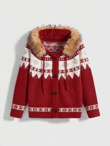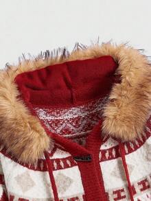 Kawaii Cardigan natalizio oversize da donna con colletto in pelliccia sintetica e decorazione con bottoni a corno, colore rosso vino